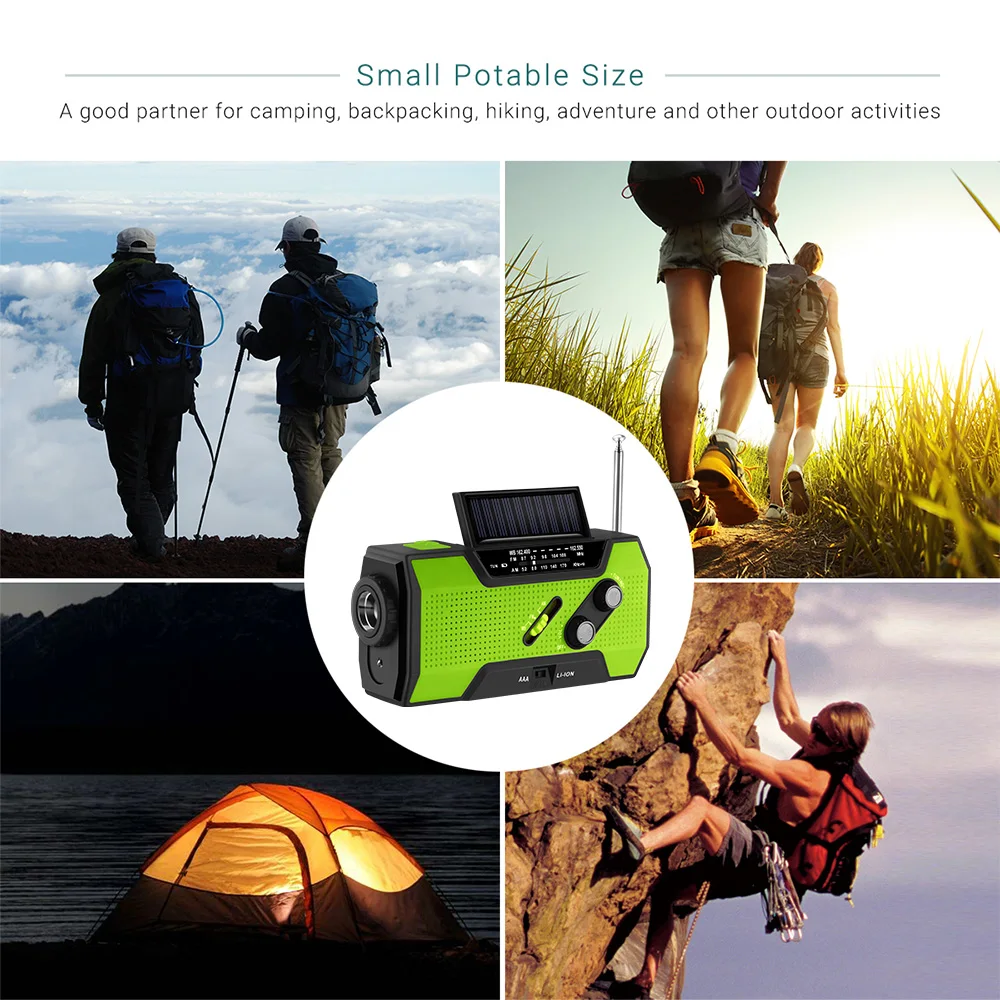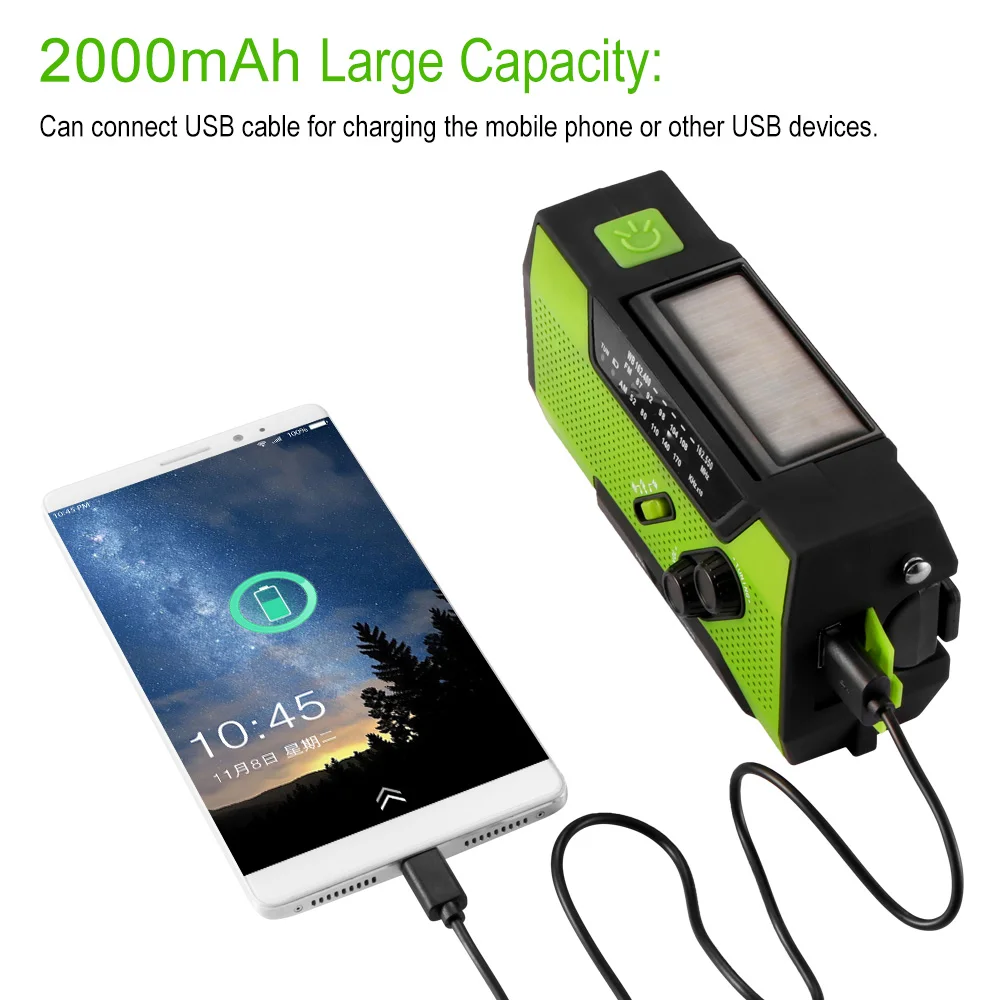 FORNORM For NOAA Weather Radio Emergency Solar Hand Crank Self Powered 3AAA Battery Flashlight 2000 mAh Power Bank Multi-purpose
