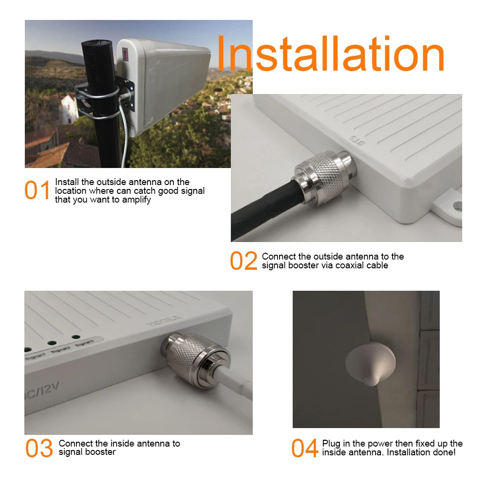 1. Закрепите приём наружной антенны на домашней вершине и направляйте в сигнальную башню. 2. Подключите наружную антенну к «наружному» порту в ретрансляторе тройникового кабеля. 3. Подключите внутреннюю антенну (ы) к «крытому» порту в репитер машине через кабель также. 4. Штекер адаптера питания в розетку переменного тока и Окончательная установка. Техническая поддержка Если после активации ретранслятора все еще нет сигнала, пожалуйста, проверьте, есть ли внешняя антенна для сигнальной башни или в другом месте, сильный сигнал и проверьте, достигается ли сила-70DBM. 2. Если вы не можете позвонить, пожалуйста, отрегулируйте направление наружной антенны. 3. Если сила не устойчива, пожалуйста, проверьте, слишком ли близки наружные и внутренние антенны. Убедитесь, что наружная и внутренняя антенна имеет расстояние 20 метров, по крайней мере, с стеной между и не в той же горизонтальной линии. Выбор аксессуаров Наружная антенна использует 7 единиц антенны типа yagI, Внутренняя антенна использует плату или антенну на крыше и сигнальный провод использовать коаксиальный кабель.