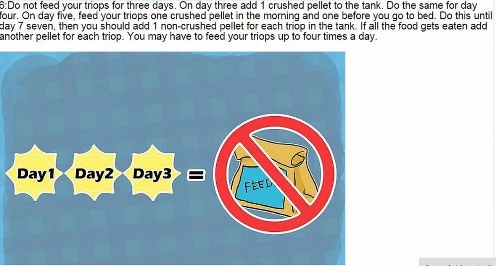 Если в конце дня в резервуаре остались гранулы с едой, вы должны удалить их, так как они могут загрязнить ваш резервуар. Зимой вы должны постоянно оставлять лампу включенной, чтобы вода оставалась в тепле. Ваши триопсы могут погибнуть, если вода станет слишком горячей или холодной. Не кормите свои триопсы, так как они в конечном итоге съедают друг друга, если они проголодаются