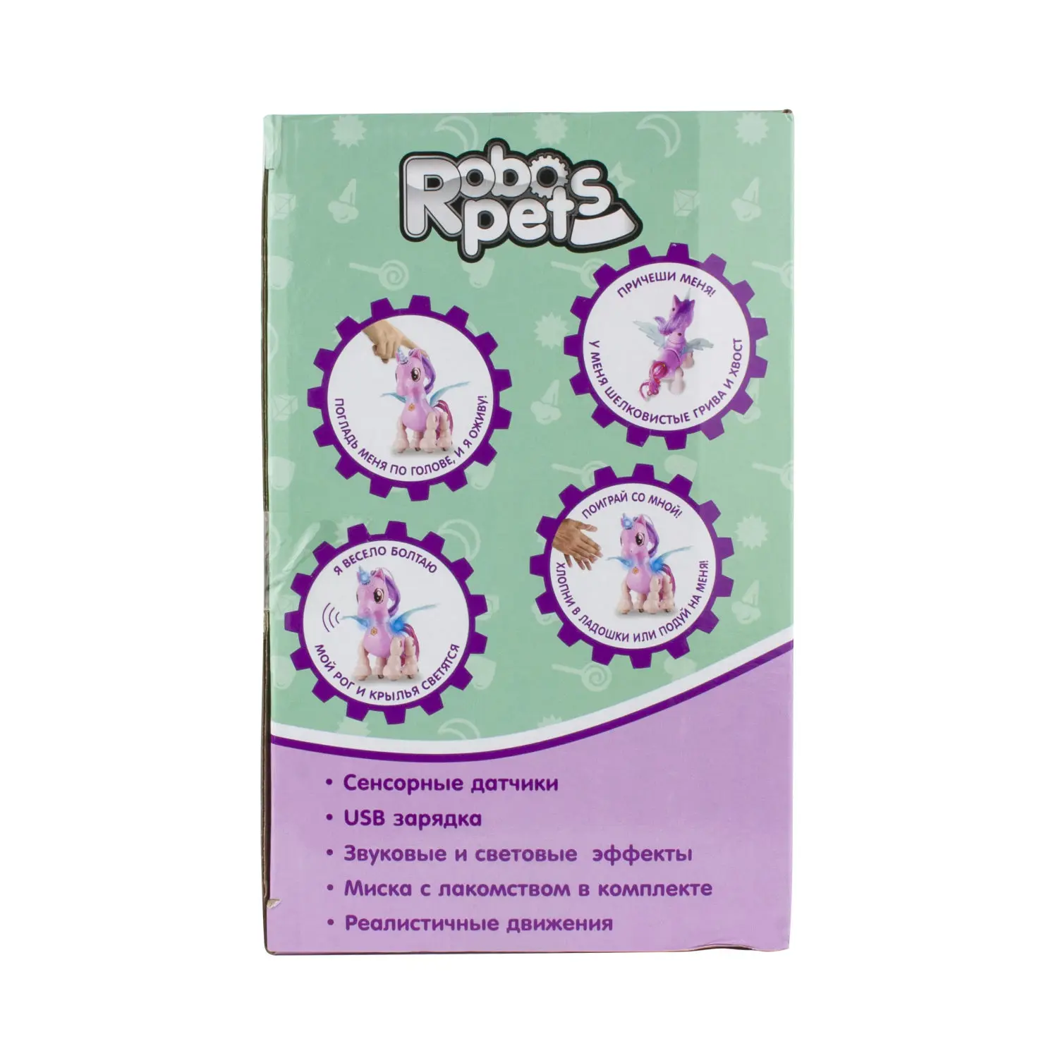 This animal is cute and very sociable! he reacts to touch, and his eyes glow.His pleasant voice and funny modeling will conquer the heart of any child.And also, the unicorn has a luxurious mane and tail, and the horn and wings shine beautifully.Your pet has a bowl of Treat & ndash; and you can encourage his treat for good behavior.Charges with a USB cable (included).Specs