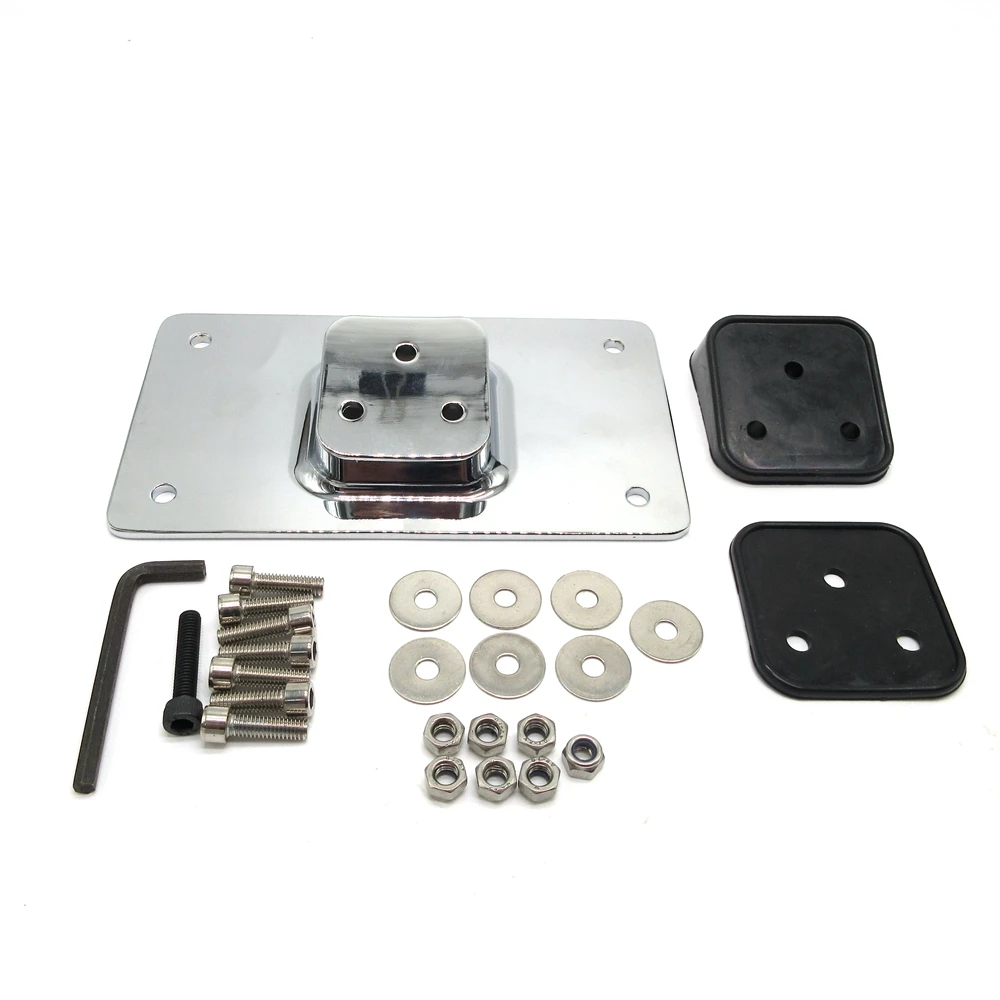 Набор монтажных кронштейнов для номерного знака Laydown, в этот комплект входит хромированный угловой кронштейн для номерного знака с подложкой. Два резиновых прокладки используются для управления вибрацией и углом, позволяя угол крепления быть поднятым или опущенным по мере необходимости.