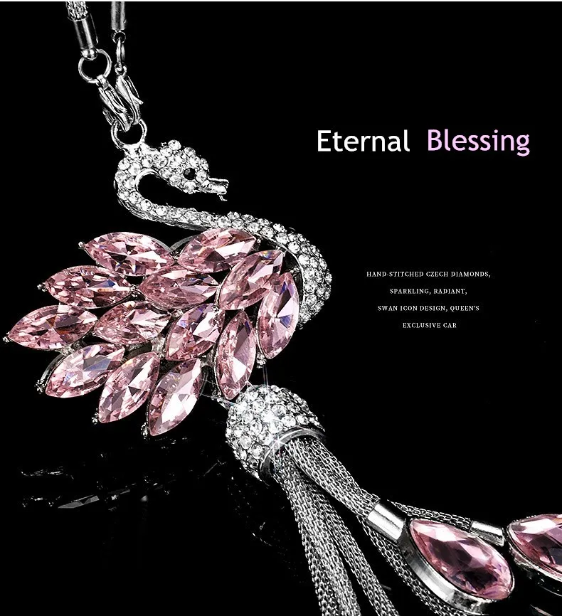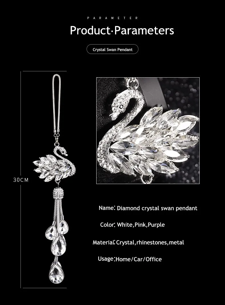 1) Название: хрустальный кулон в виде лебедя 2) Цвет: белый, розовый, фиолетовый 3) Материал: Стразы. Хрусталь 4) Функция: украсьте свой автомобиль 5) Размер: около 32 см