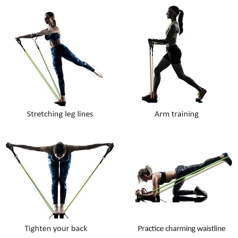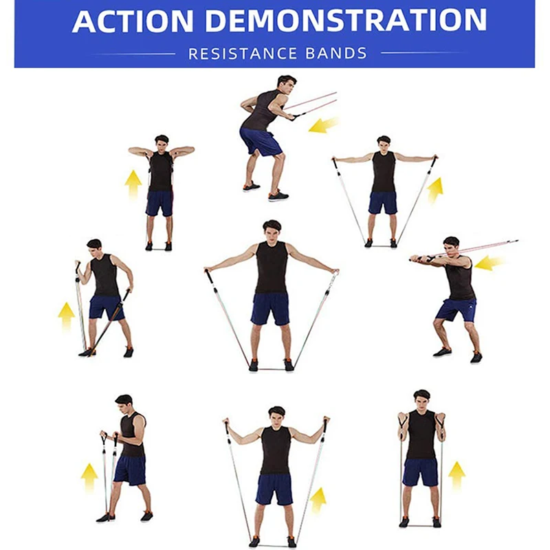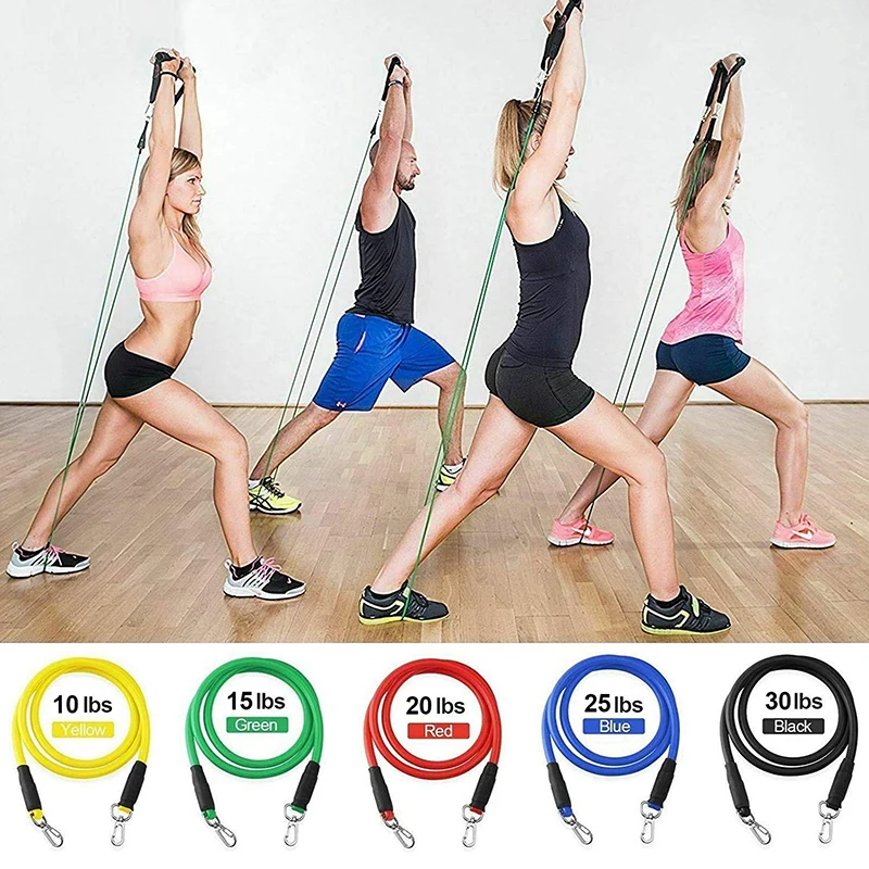 5 цветовых полос с разным уровнем натяжения: (длина ремешка: 120 см/47,2 дюйма) Черный ремешок: 30 фунтов Синий ремешок: 25 фунтов Красный ремешок: 20 фунтов Зеленый ремешок: 15 фунтов Желтый ремешок: 10 фунтов Материал: 1. Резинки (Трубы сопротивления) изготовлены из профессионального латекса натурального каучука; 2. Ручки изготовлены из прочной мягкой пены; 3. Зажимы изготовлены из цинкового сплава; Функция: Руки, плечи, грудь, живот, ягодицы, ноги, тело, комплексное фитнес-Упражнение