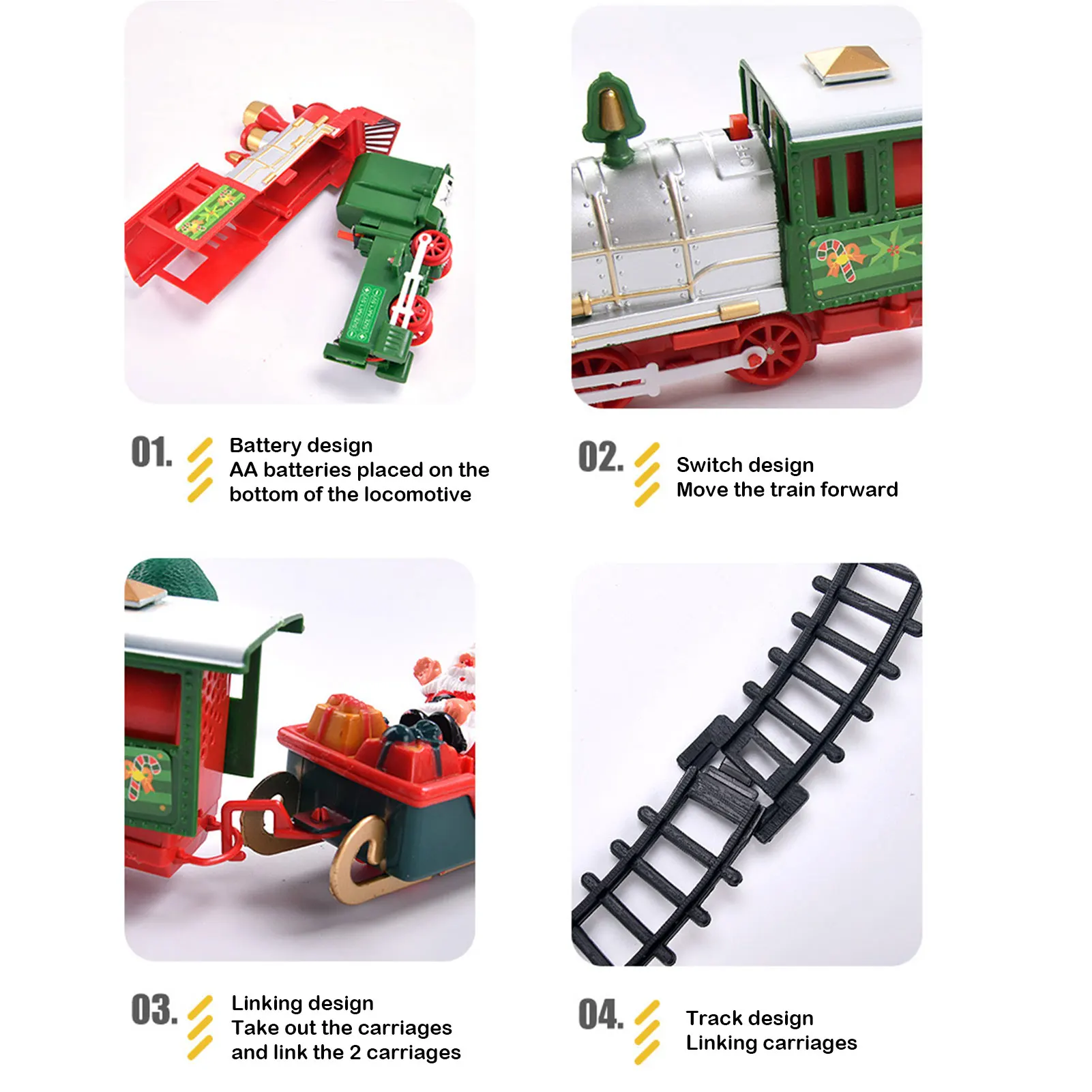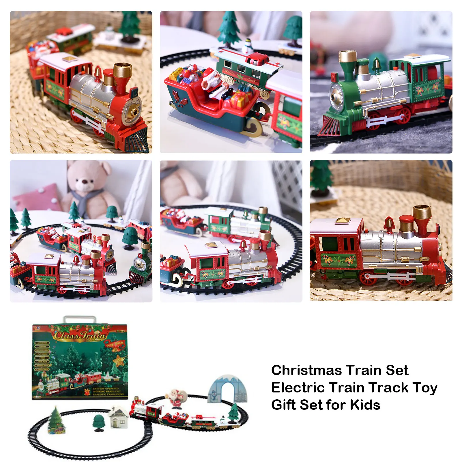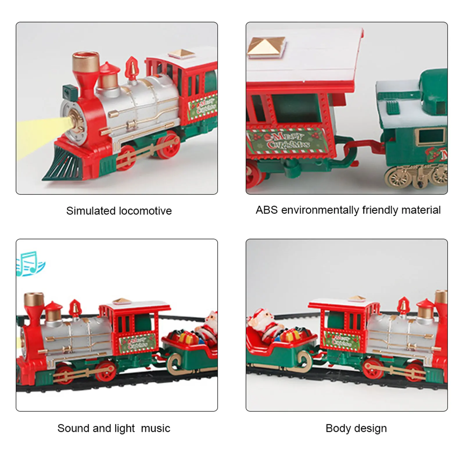 2. Изготовленная игрушка поезда: этот Рождественский набор поездов имеет красивую мелодию, крутые огни, когда поезд движется, сопровождается огнями, имитацией звуков поезда, с фарами, реалистичные звуки и другие эффекты. Слушайте реалистичные звуки рогов локомотива и наслаждайтесь прослушиванием знаменитостей, мы желаем вам счастливого Рождества и мелодии колокольчиков.