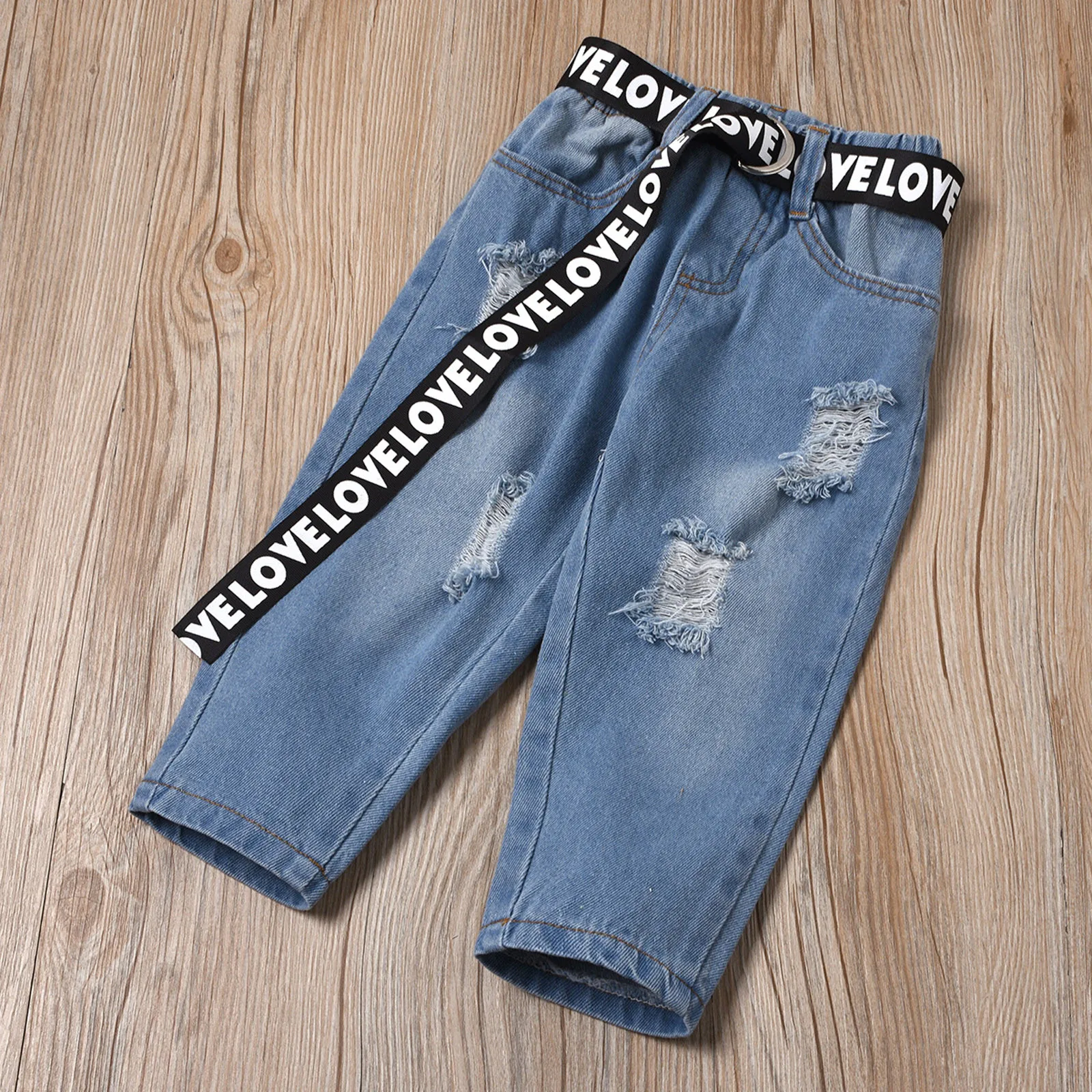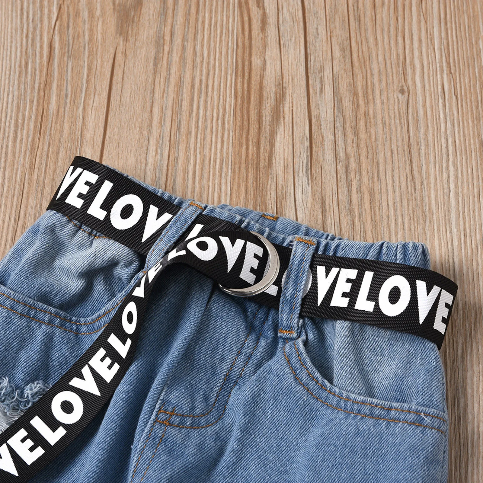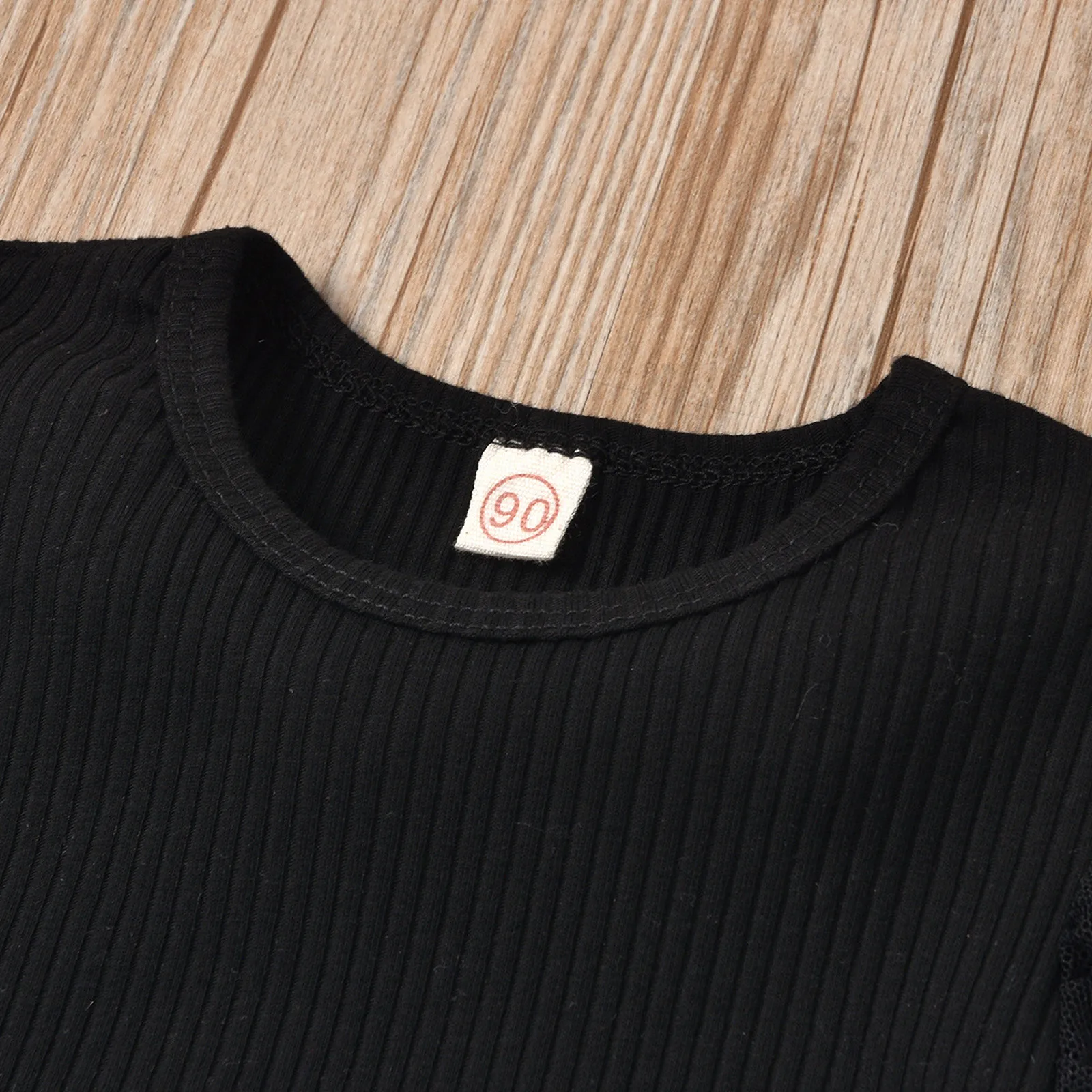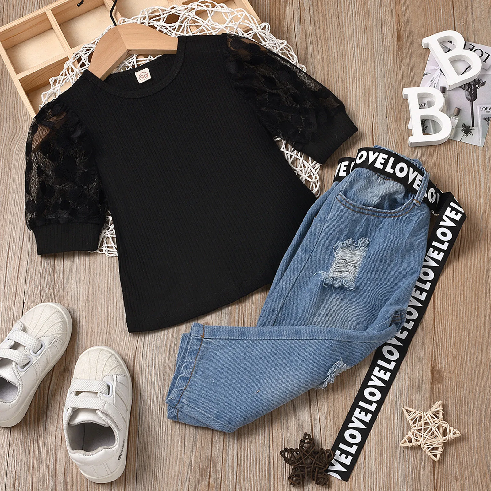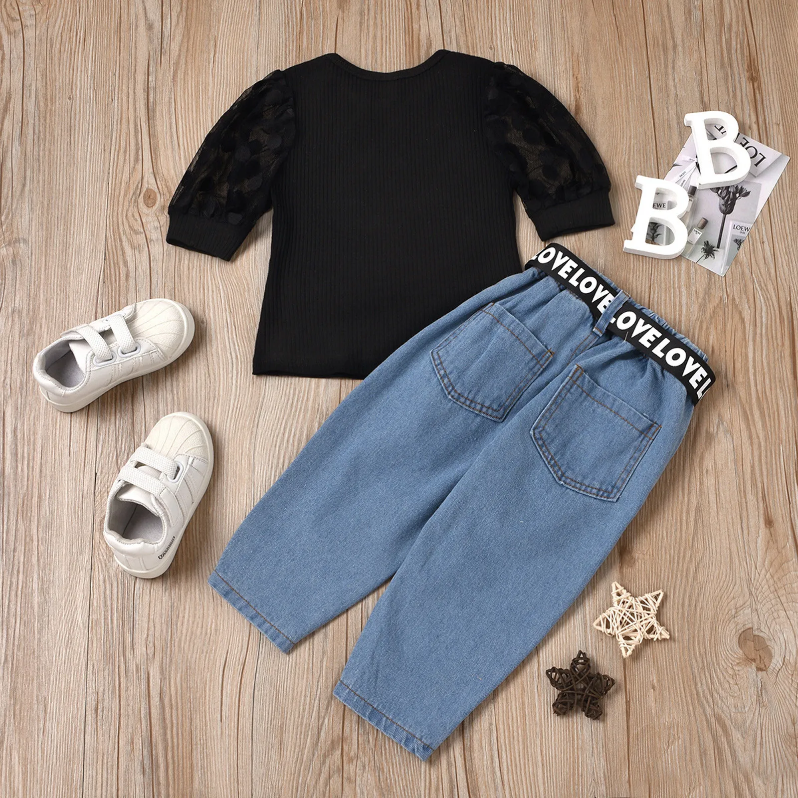 Кружевная футболка в рубчик для маленьких девочек топы, джинсовые штаны, комплект одежды