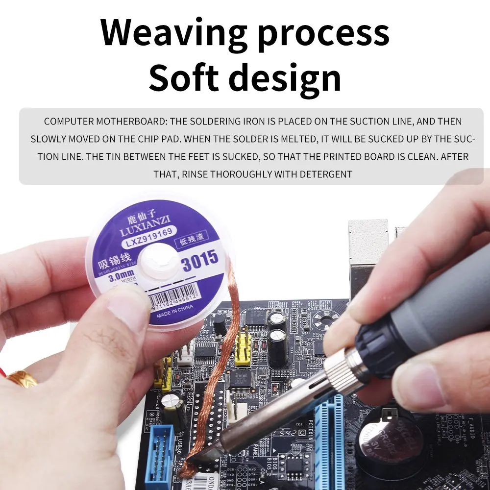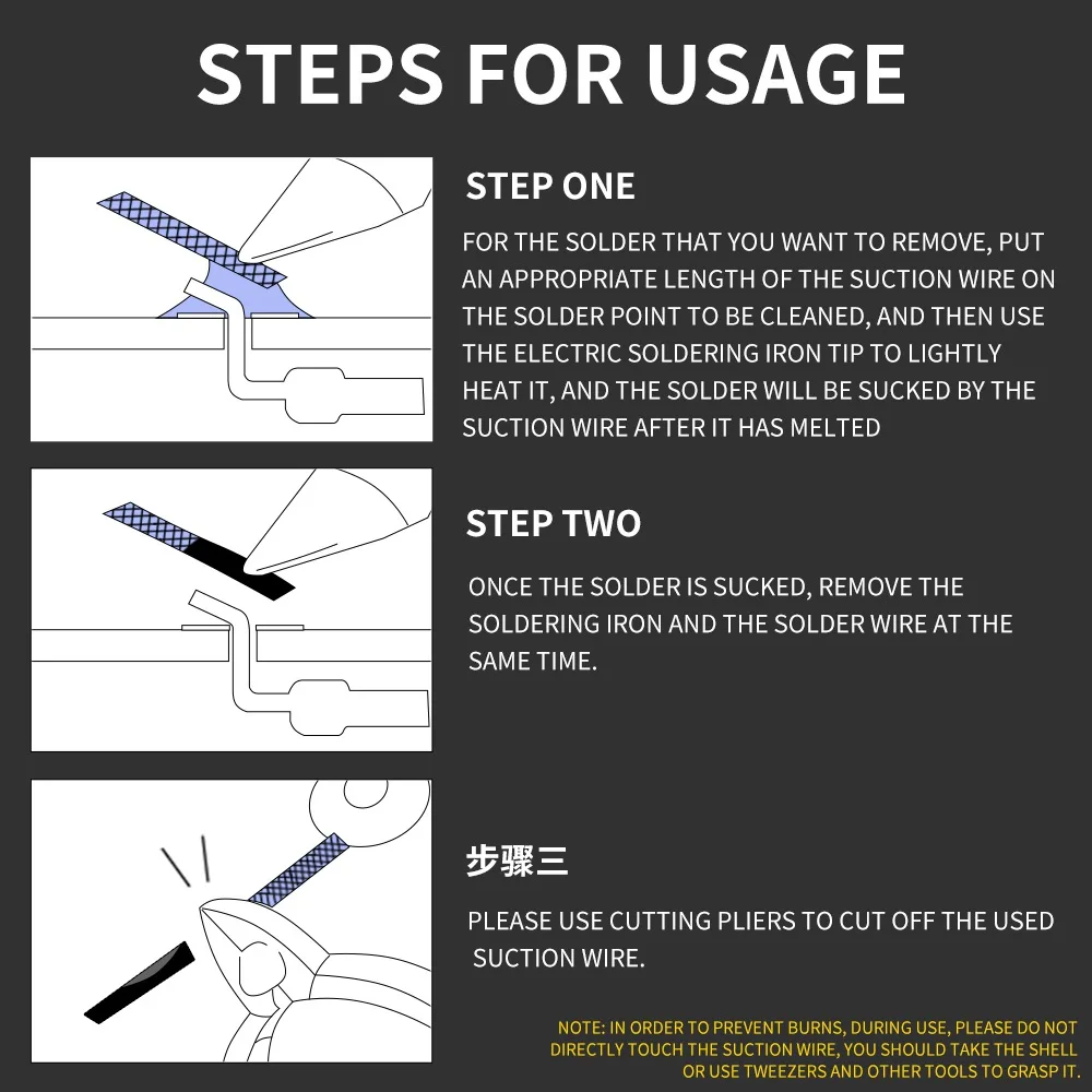 Примечание: во избежание ожогов, во время использования, пожалуйста, не прикасайтесь непосредственно к всасывающей проволоке, пожалуйста, держите оболочку или используйте пинцет и другие инструменты, чтобы захватить ее.