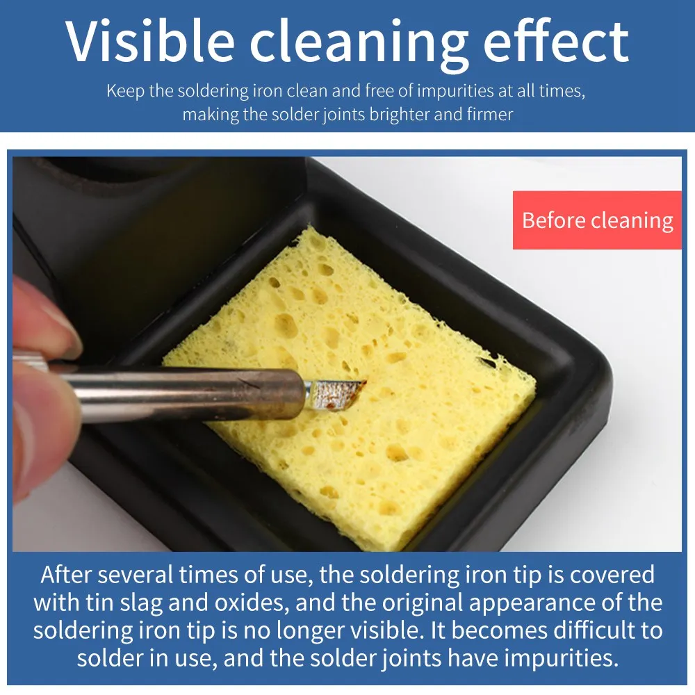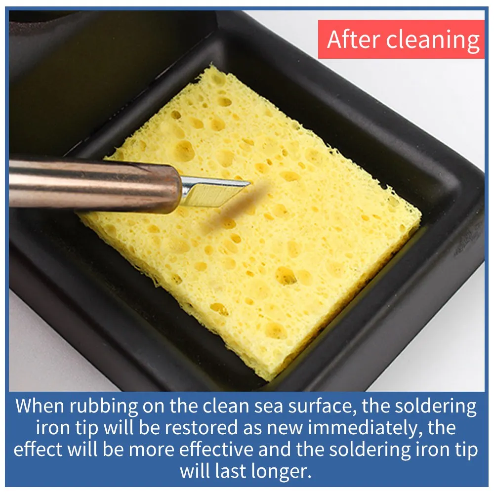 5. Предусмотренная губка для очистки используется для очистки жала паяльника. Губку нужно замочить немного воды, а затем жало паяльника несколько раз втирают на чистящую губку. Жало паяльника немедленно обновляется, что делает ремонт и сварку более удобными и делает жало паяльника более длительным сроком службы