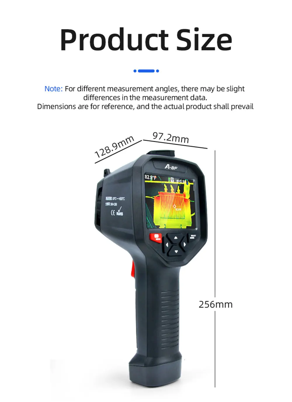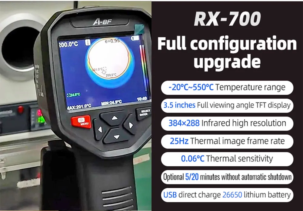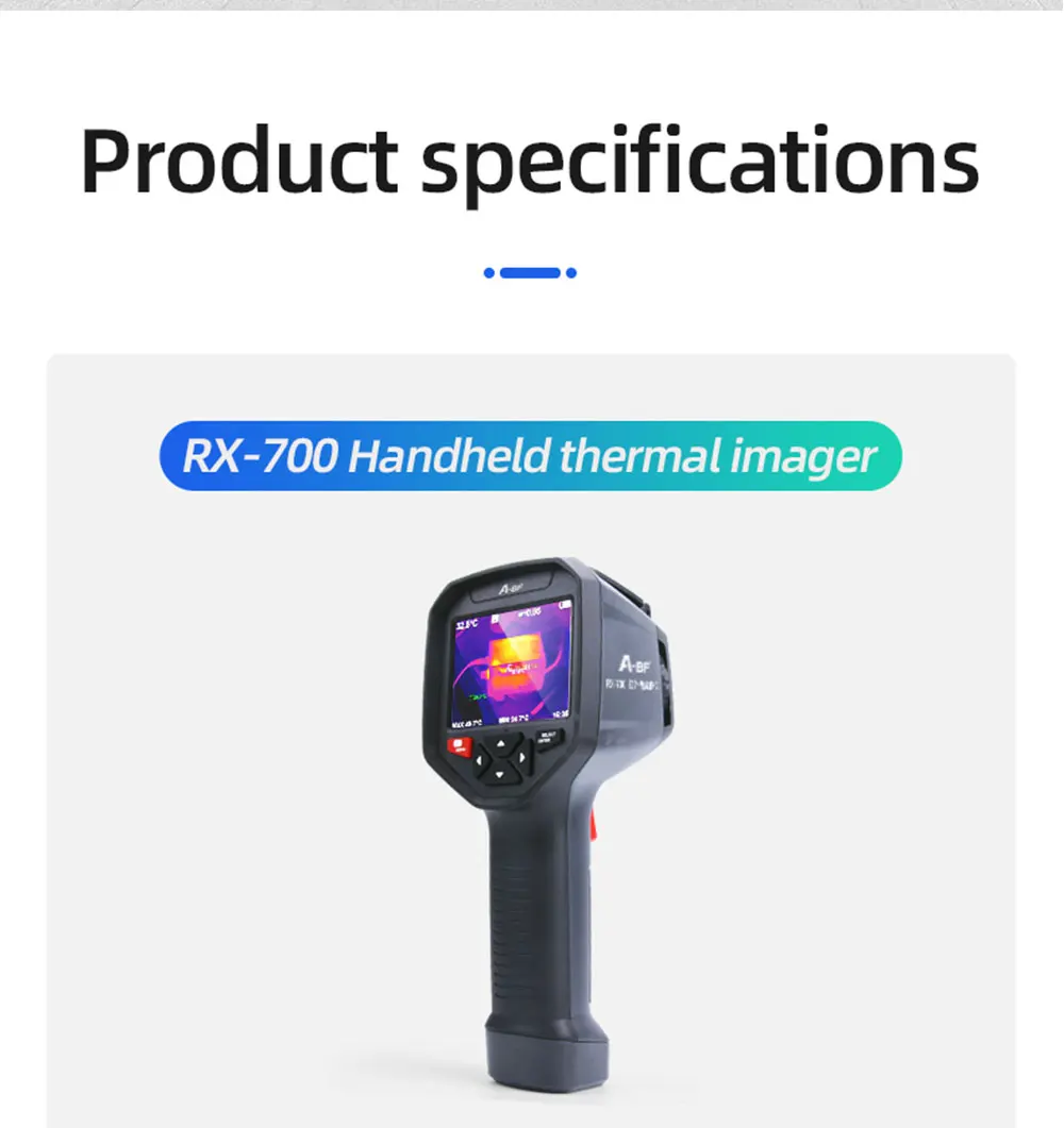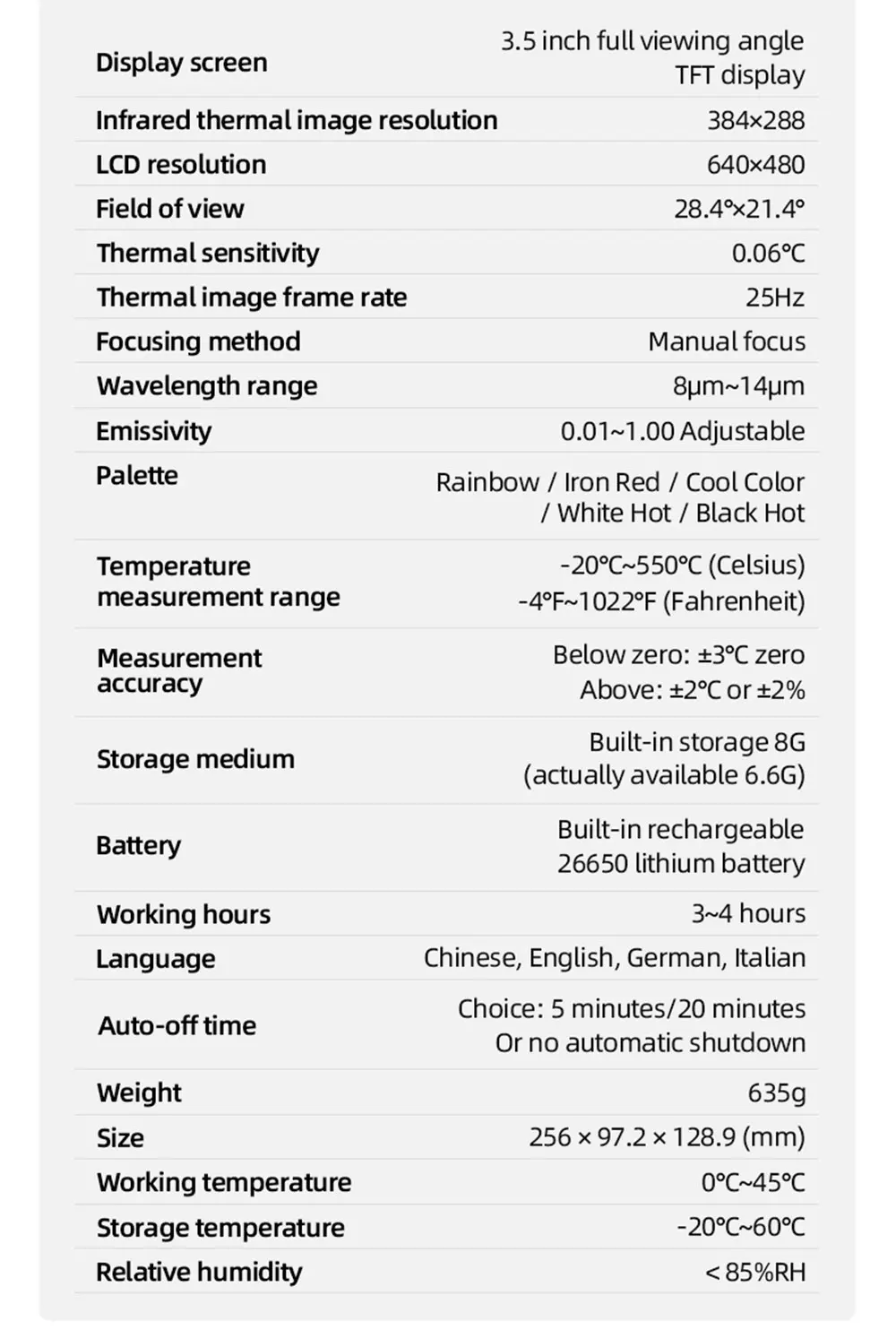 ● Дисплей экран: 3,5 дюймов полный угол обзора на тонкопленочных транзисторах на тонкоплёночных транзисторах экрана ● Разрешение инфракрасного изображения: 384*288 ● Разрешение экрана дисплея: 640*480 ● Угол поля/кратчайшая длина Фокуса: 13 мм ● Тепловая чувствительность: ≤ 60mk @ 25 ℃,F #1,0 ● Диапазон измерения температуры: от-20 ℃до 550 ℃ (от-4 °F до 1022 °F) ● Точность измерения: ± 2% цифровой/± 2 ℃ ●Emissivity: регулируется от 0,01 до 1,0 ● Частота кадров тепловых изображений: 25 Гц/50 Гц ● Объем памяти: Встроенный 3G (более 20 тысяч сохраненных изображений) ● Источник питания: Встроенный заряжаемый аккумулятор 26650 мАч ● Автоматическое выключение "Выбор: 5 минут/20 минут/не выключается автоматически ● Размер изделия (длина * ширина * высота):97 мм * 129 мм * 256 мм ● Рабочая температура: от 0 ℃до 45 ℃ ● Температура хранения: от-20 ℃до 60 ℃ ● Относительная влажность:<85% относительной влажности