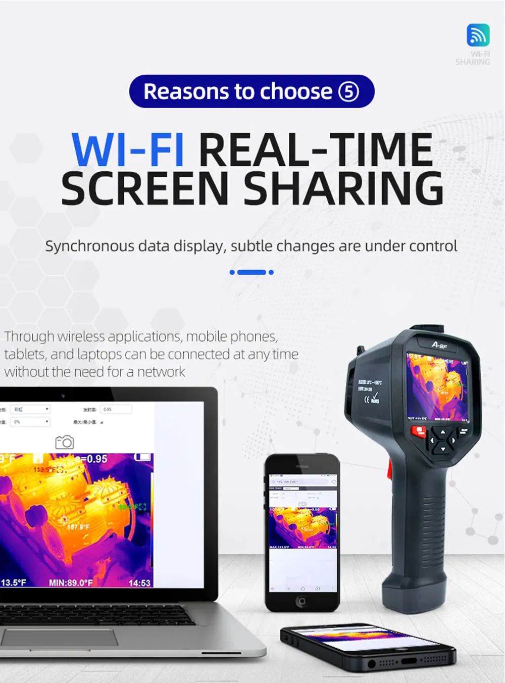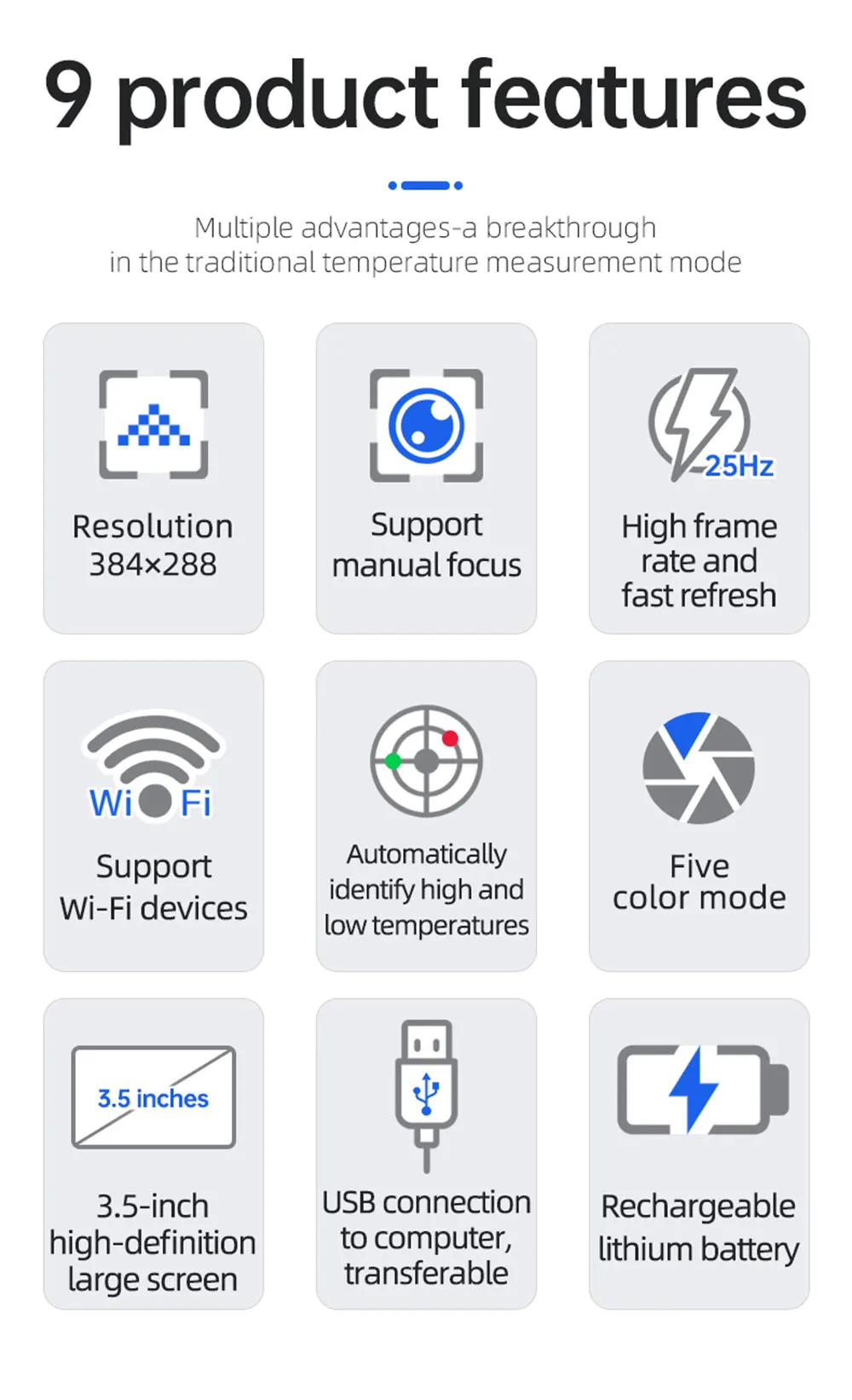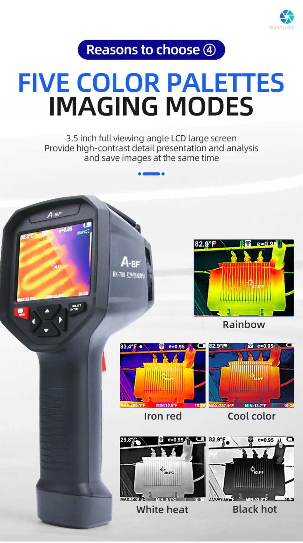 ● Дисплей экран: 3,5 дюймов полный угол обзора на тонкопленочных транзисторах на тонкоплёночных транзисторах экрана ● Разрешение инфракрасного изображения: 384*288 ● Разрешение экрана дисплея: 640*480 ● Угол поля/кратчайшая длина Фокуса: 13 мм ● Тепловая чувствительность: ≤ 60mk @ 25 ℃,F #1,0 ● Диапазон измерения температуры: от-20 ℃до 550 ℃ (от-4 °F до 1022 °F) ● Точность измерения: ± 2% цифровой/± 2 ℃ ●Emissivity: регулируется от 0,01 до 1,0 ● Частота кадров тепловых изображений: 25 Гц/50 Гц ● Объем памяти: Встроенный 3G (более 20 тысяч сохраненных изображений) ● Источник питания: Встроенный заряжаемый аккумулятор 26650 мАч ● Автоматическое выключение "Выбор: 5 минут/20 минут/не выключается автоматически ● Размер изделия (длина * ширина * высота):97 мм * 129 мм * 256 мм ● Рабочая температура: от 0 ℃до 45 ℃ ● Температура хранения: от-20 ℃до 60 ℃ ● Относительная влажность:<85% относительной влажности