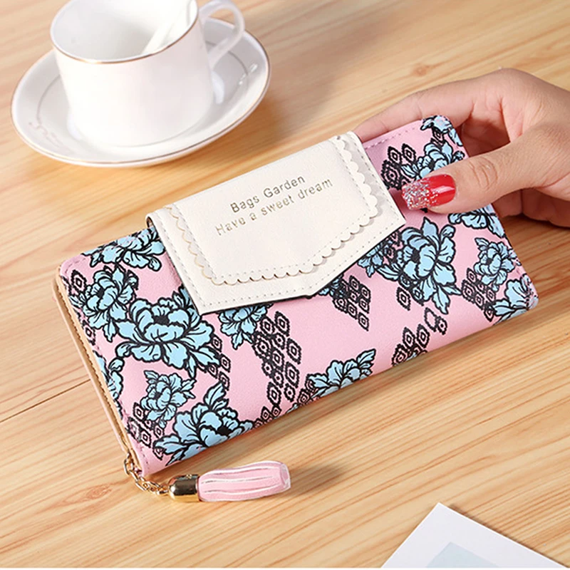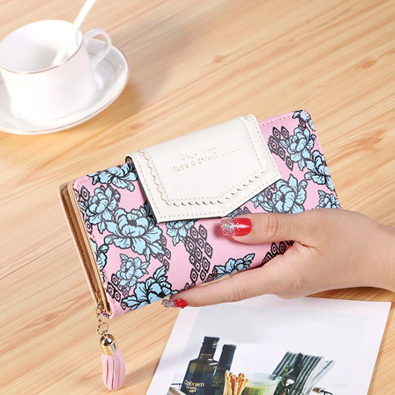 Женские кошельки-клатчи на молнии с кисточками, цветочный с застежкой, Женский Длинный кошелек, брендовый дизайнерский держатель для карт и фотографий, сменный кошелек для женщин