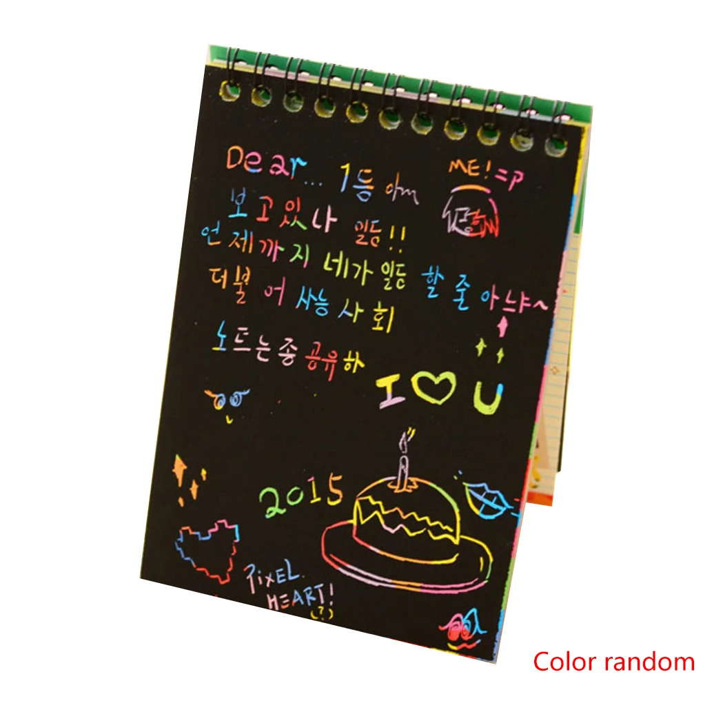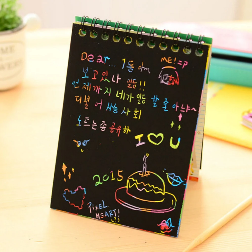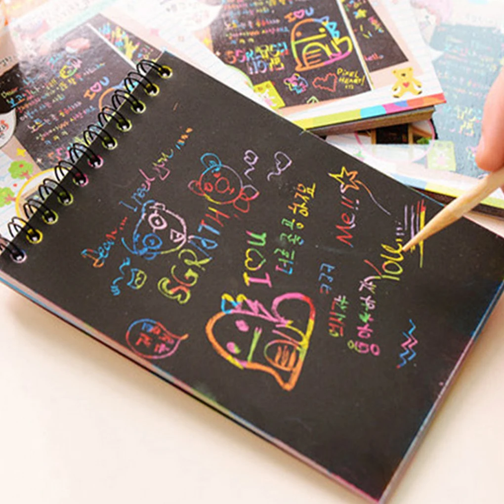 Просто поцарапайте черное покрытие с помощью встроенного деревянного стилуса, чтобы показать калейдоскоп цветов под ним.