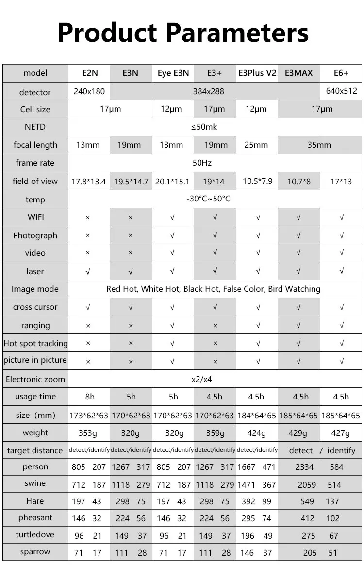 ● Мощный объективный объектив в сочетании с профессиональным тепловизионным датчиком класса с NETD <40 mK обеспечивает исключительные возможности обнаружения. Средняя цель человеческого размера может быть обнаружена на расстоянии до 1300 м в полной темноте в зависимости от модели.