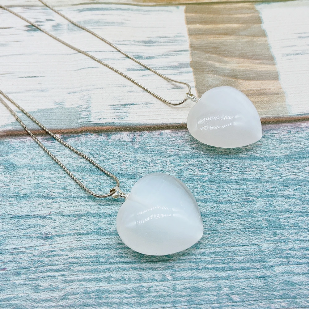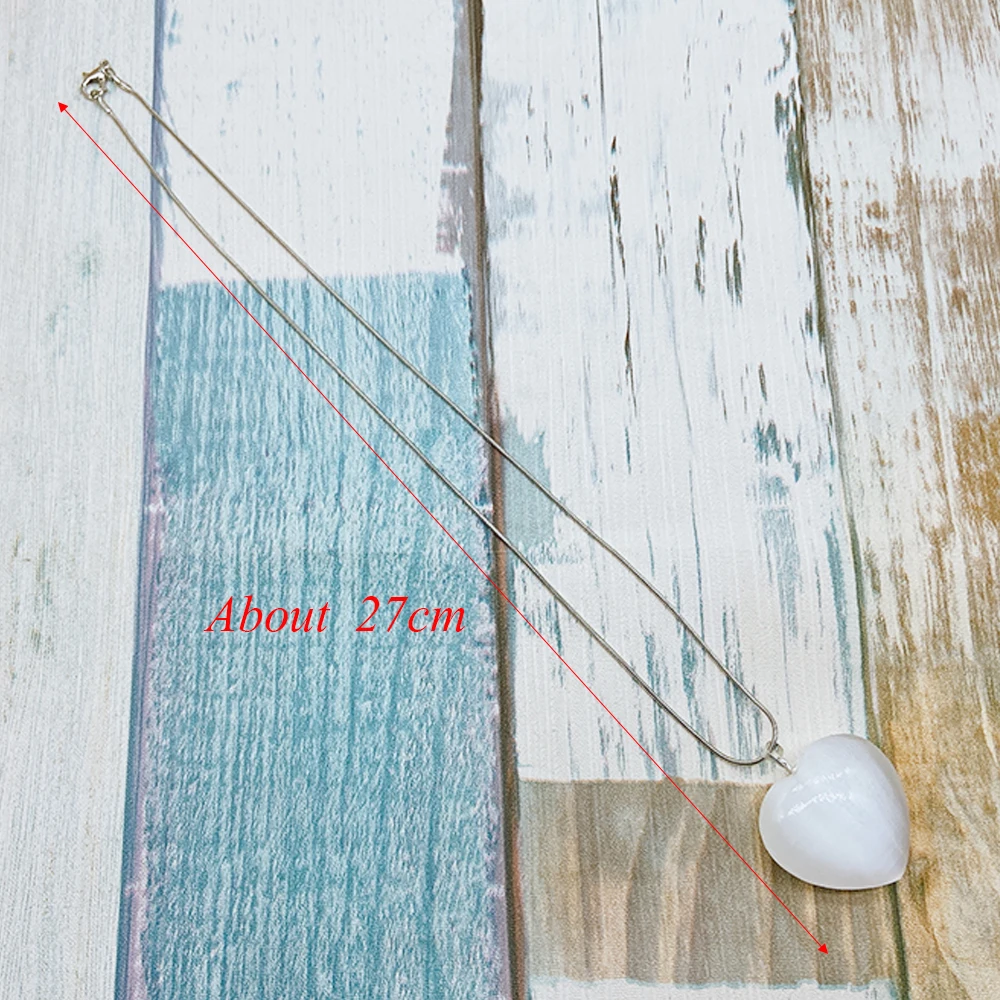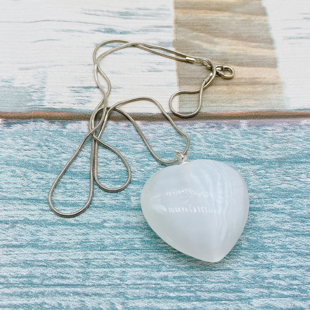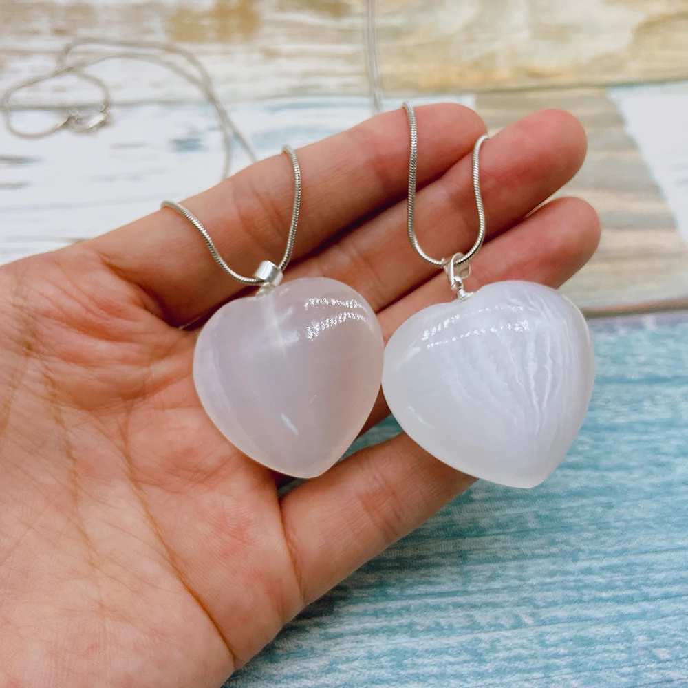 3,2 см натуральный селенит кристалл камень ожерелье в форме сердца кулон с серебряной цепочкой орнамент маятник штукатурка кварц для лечения полезных ископаемых драгоценный камень баланс для женщин, ювелирные изделия в качестве подарка
