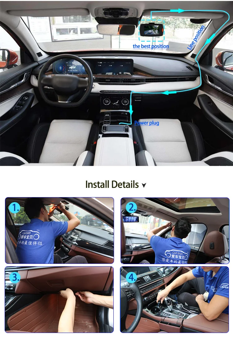 1. Выберите правильное положение: Завяжите регистратор и зеркало заднего вида вместе с ремешком (тип присоски можно зафиксировать непосредственно на лобовом стекле), зафиксируйте устройство и подключите отверстие питания.