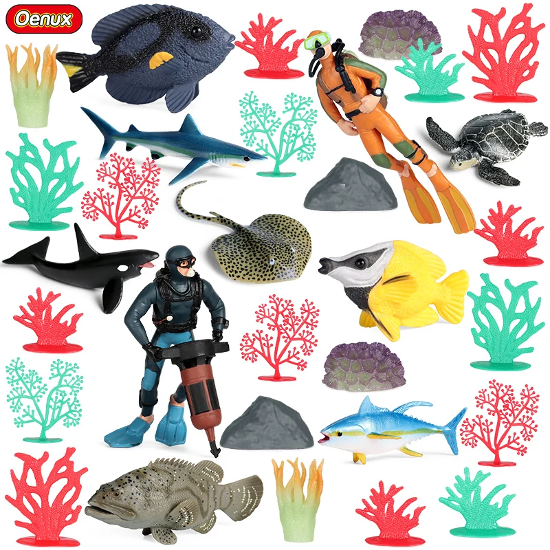 Характеристика:Oenux аквариум ныряльщик коралловый кальмар креветка Краб Акула Модель черепахи фигурки морские животные миниатюрный детский душ детская пляжная игрушка