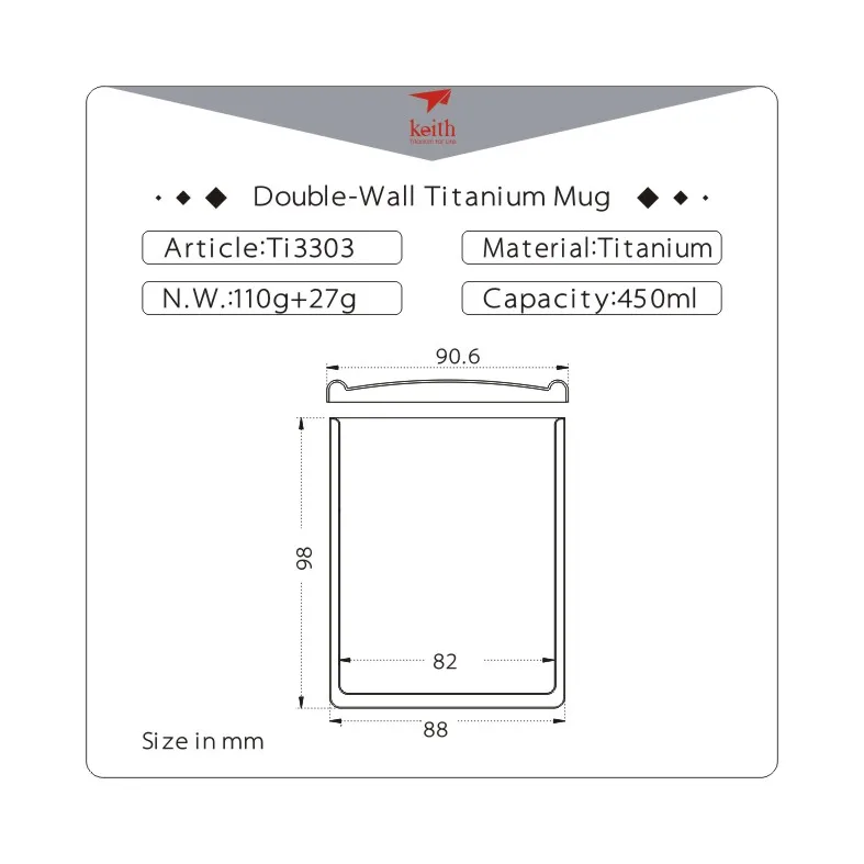 Кружка с двойными стенками изготовлена из чистого титана без подкладки и премиального покрытия. Он безвкусный, без запаха и нетоксичный. Первоначально предназначенная для пеших прогулок, кемпинга и путешествий, эта кружка также идеально подходит для пикников, дома и в офисе. Титан-это сверхпрочный светильник; Он экологически чистый, биосовместимый и антибактериальный; Он также чрезвычайно гипоаллергенен и исключительно устойчив к коррозии.