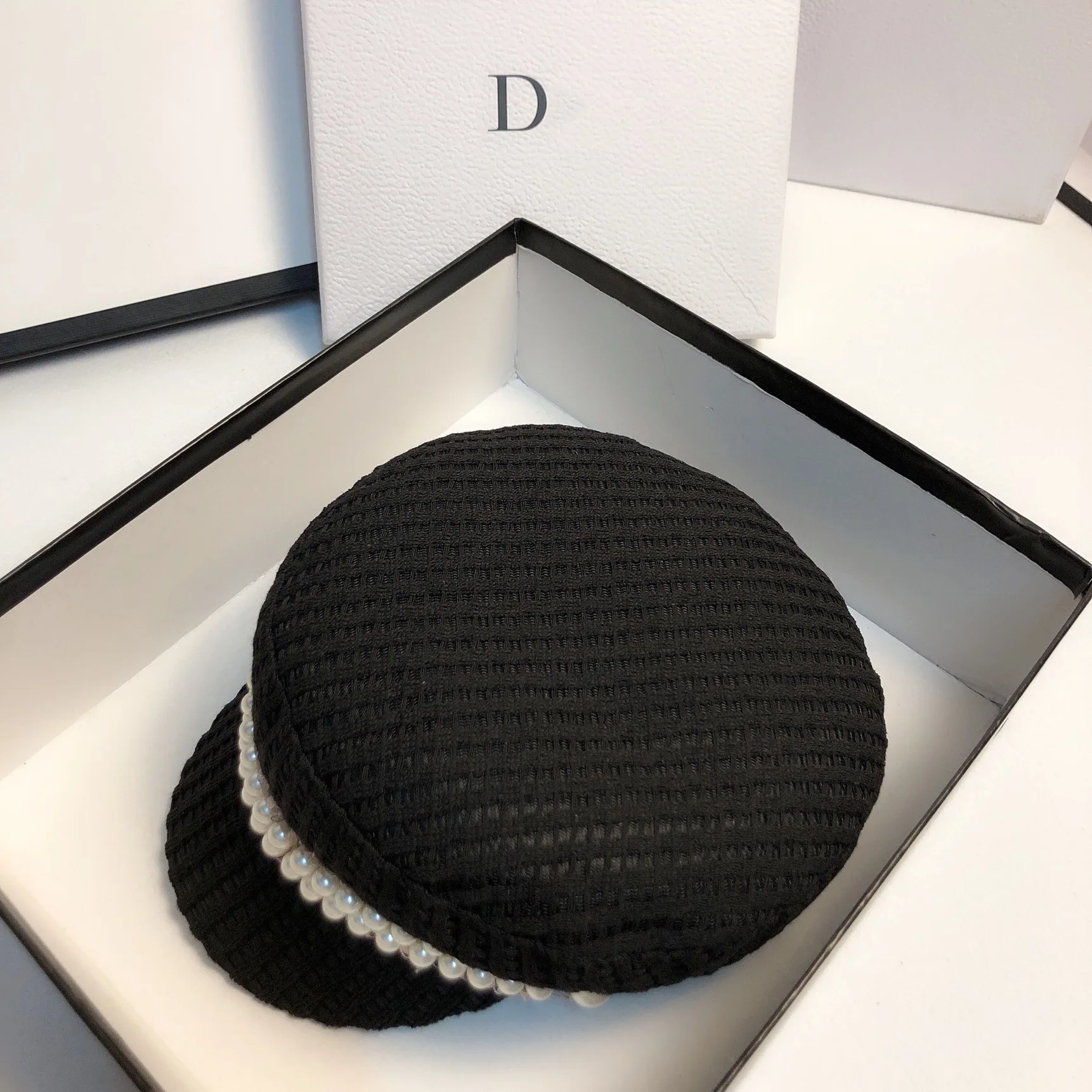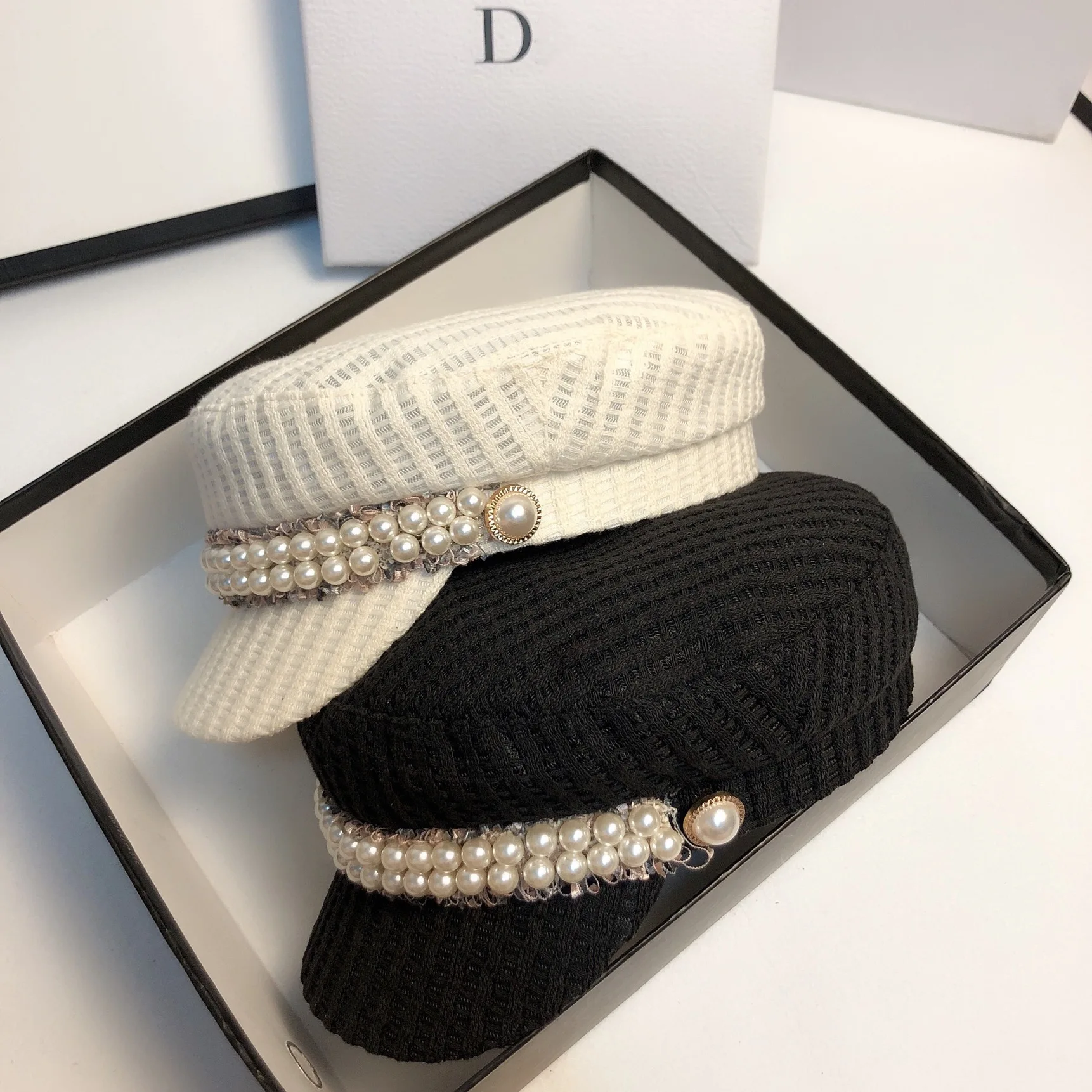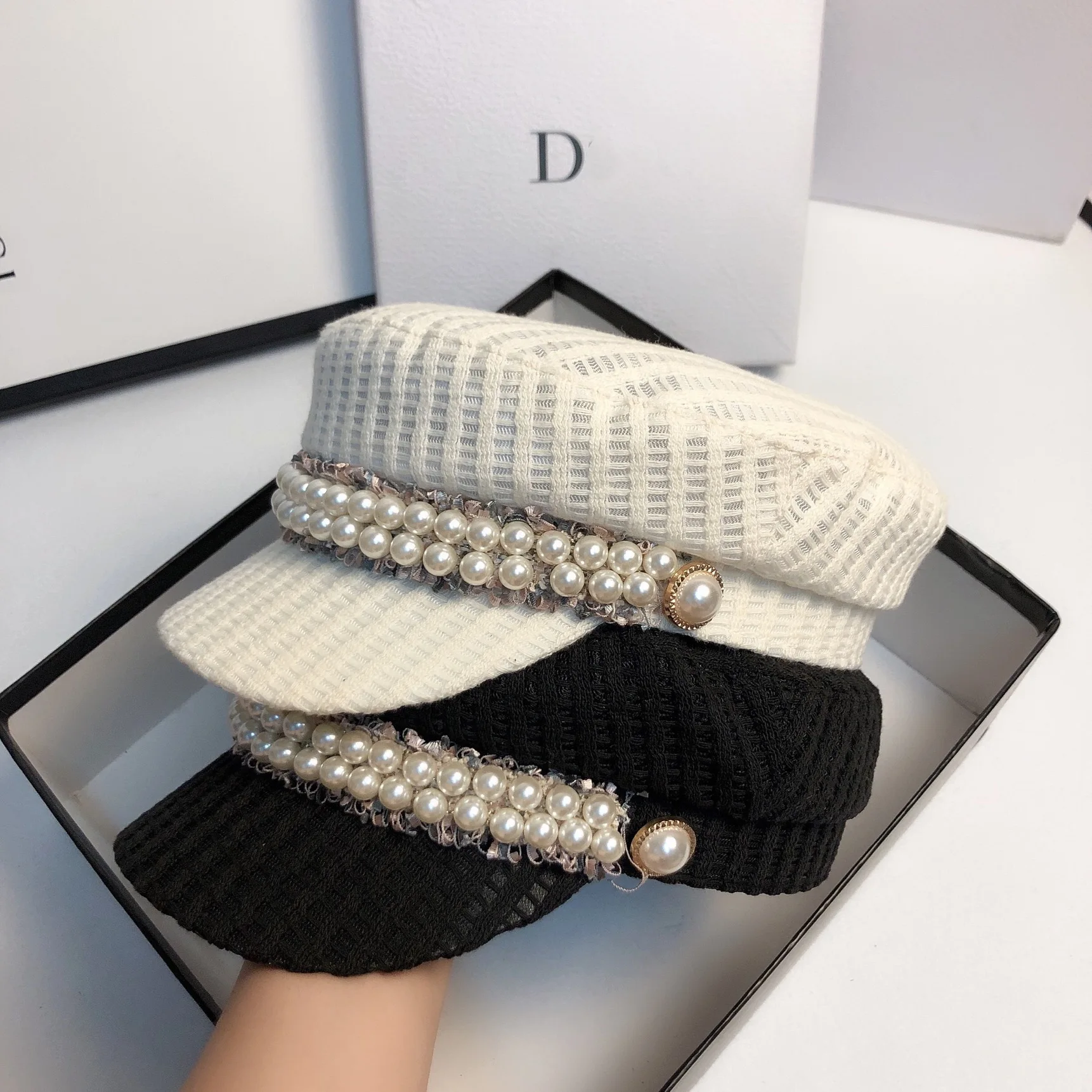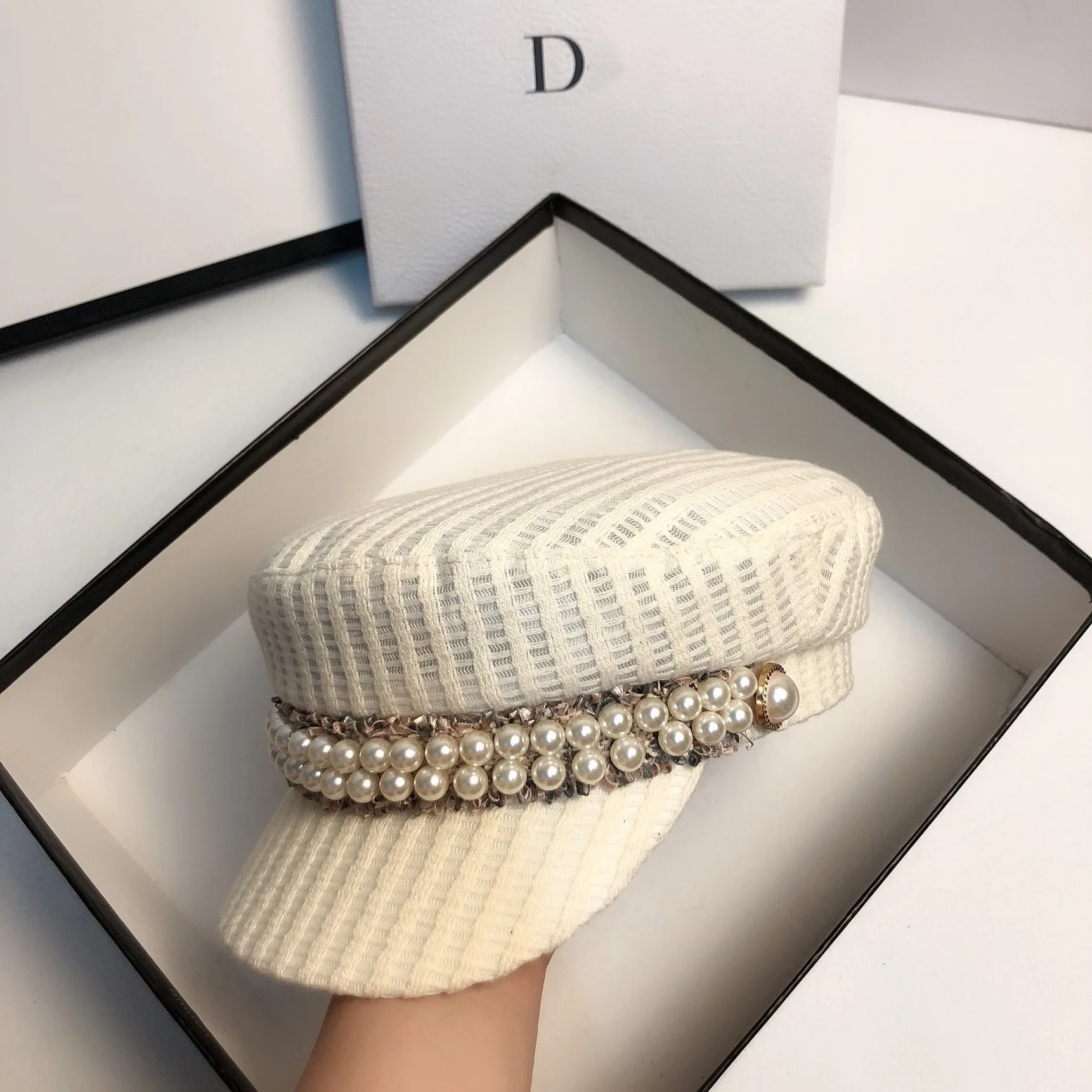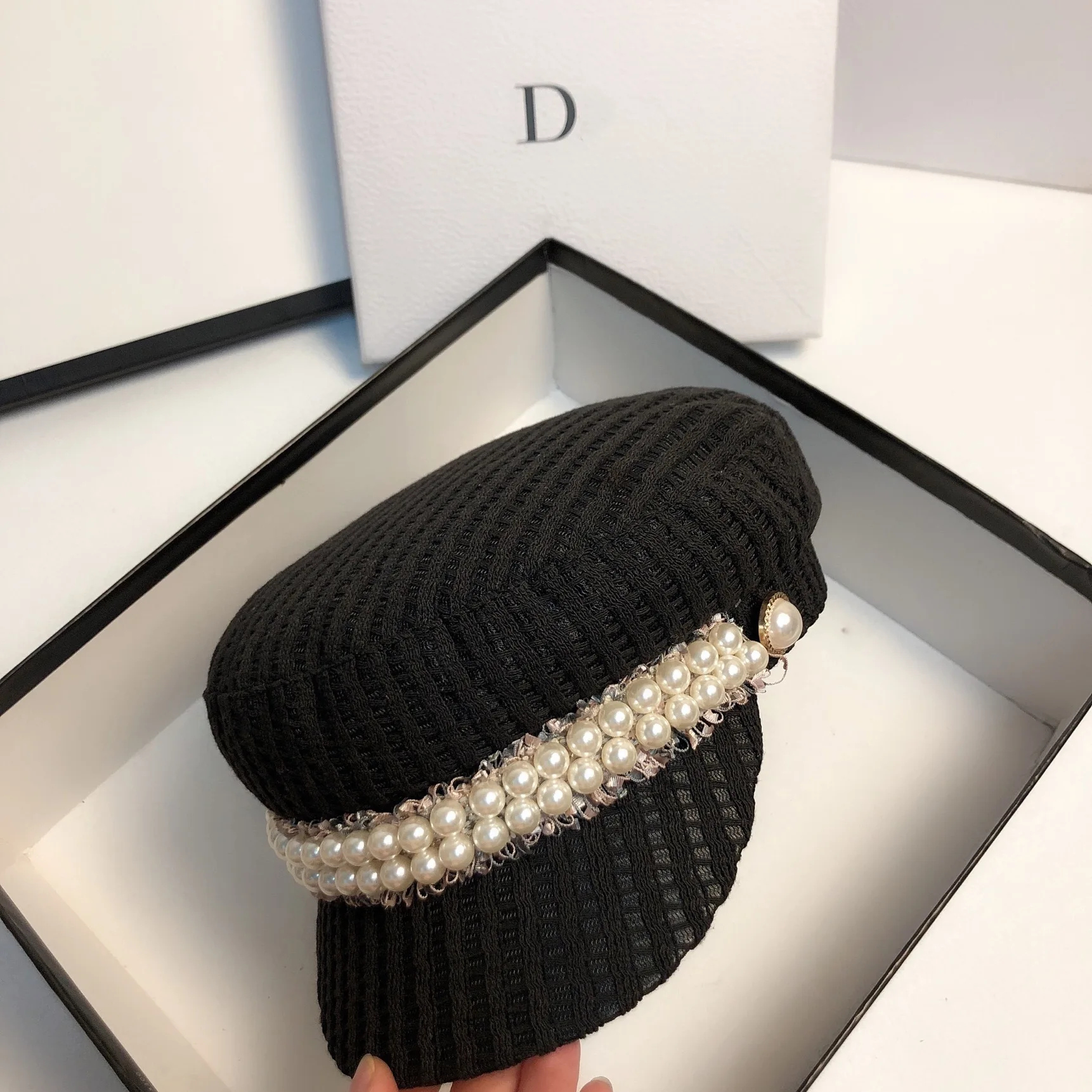 Дизайн Новый стиль кисточкой жемчуг темно-синяя шляпа корейские тонкие вязаные шапки модные дышащие уличный стиль большой вентилятор восьмиугольная шляпа для женщин