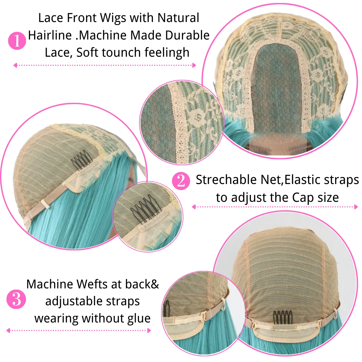 3 гибких гребня-по бокам для надежной посадки. Регулируемые ремешки-сзади, чтобы отрегулировать шапку парика до размера головы.