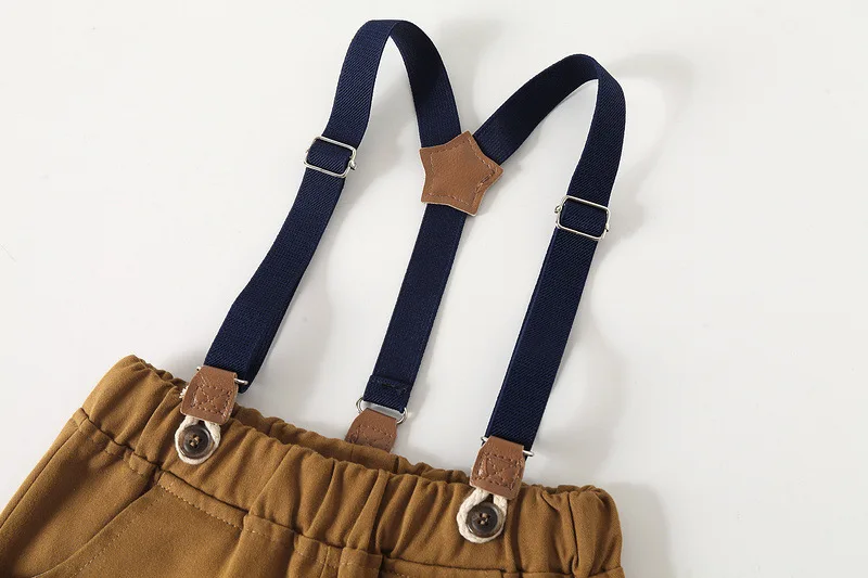 Новый Модный комплект одежды джентльмена для мальчиков, рубашка в полоску с длинными рукавами и галстуком-бабочкой + штаны на подтяжках повседневная одежда костюм для мальчиков