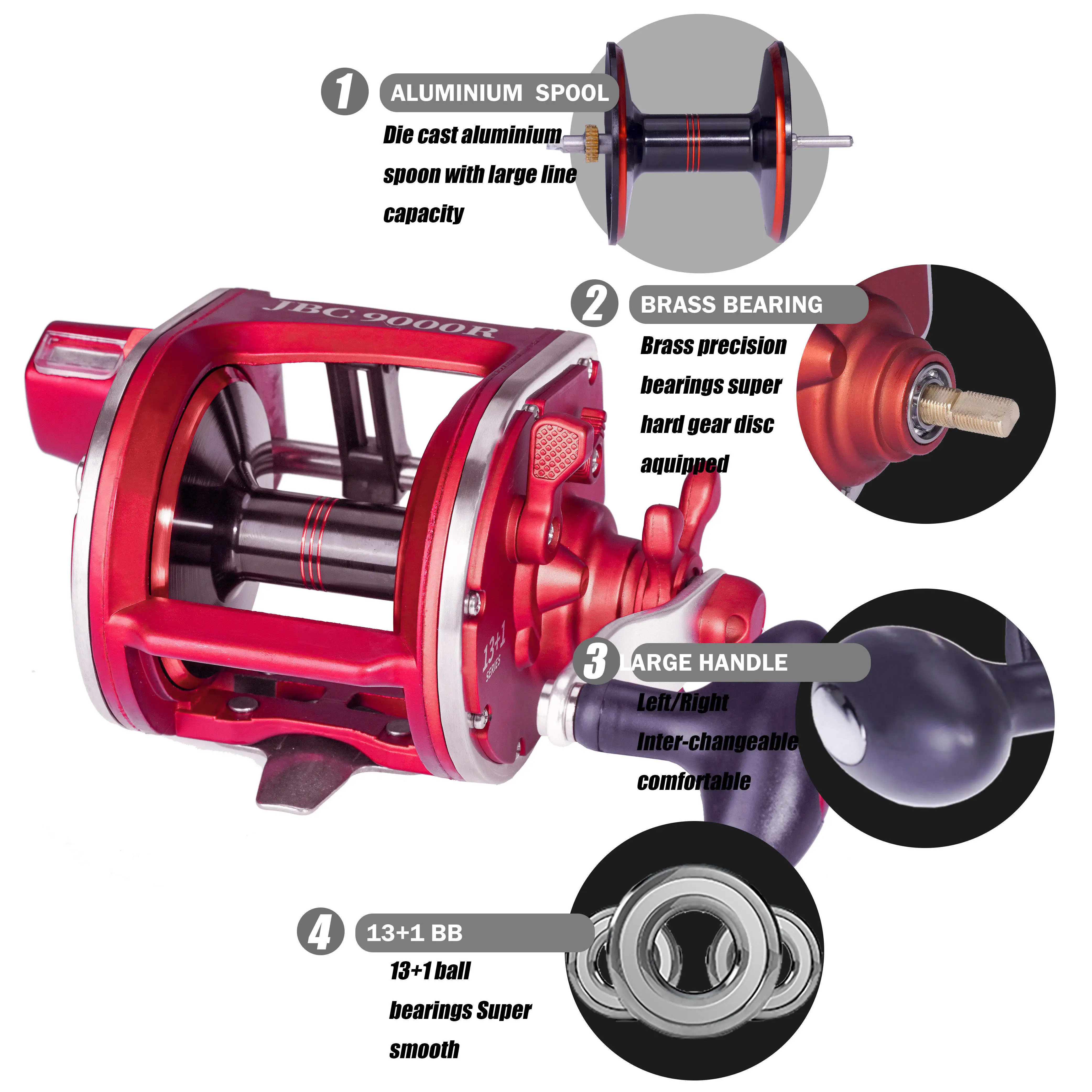 Правый красный JBC9000 | Вес: 580g | Шестерни передаточное число: 3,6: 1 | Подшипника: 13 + 1 | Максимальная сила натяжения: 25 кг | Линия Ёмкость (мм-М): 0,45/480 0,50/420 0,55/320