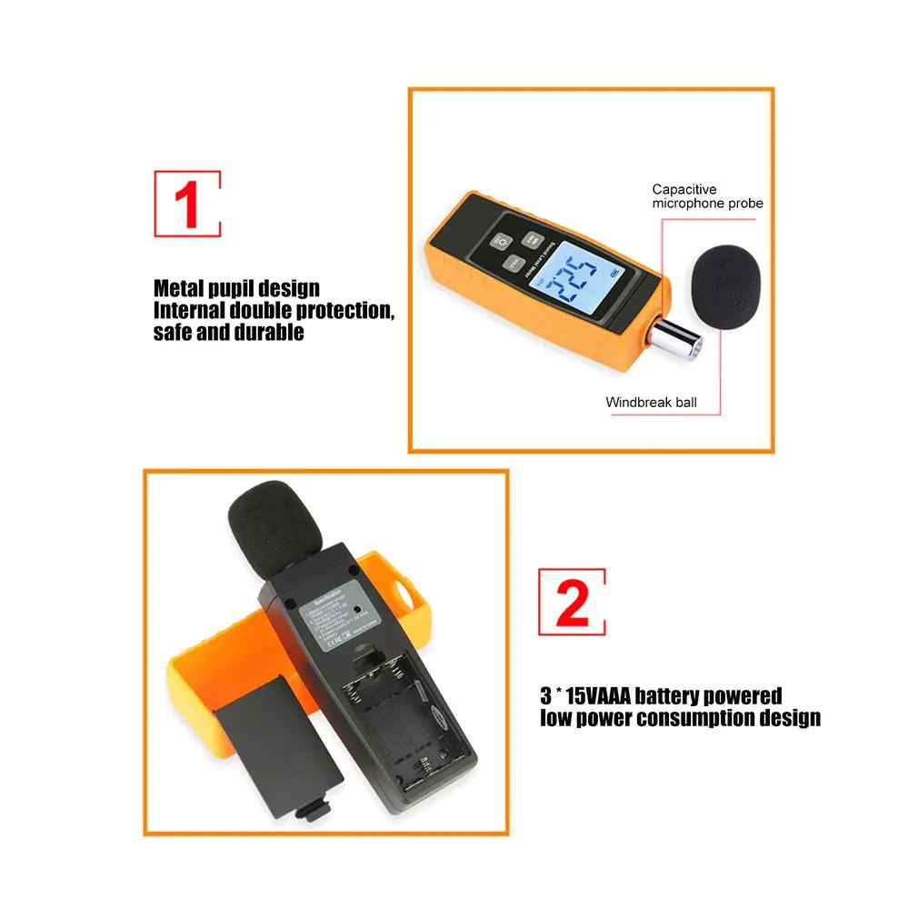 1. The precision noise meter is powered by AAA batteries and has a low power consumption design.