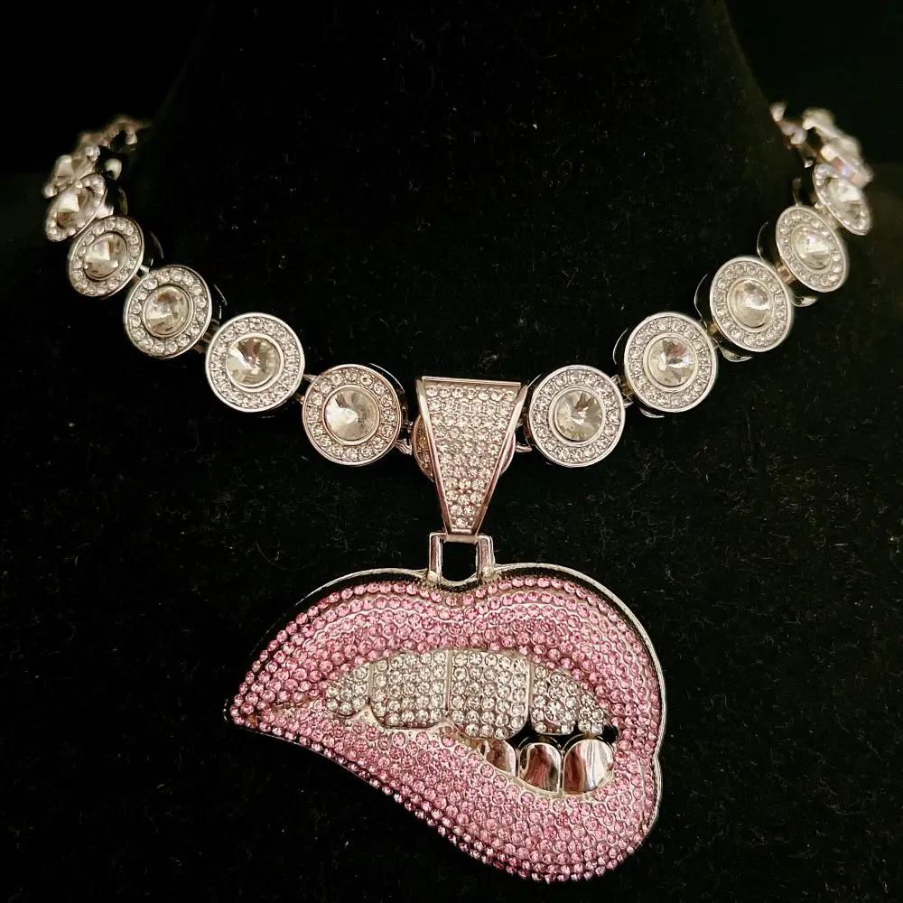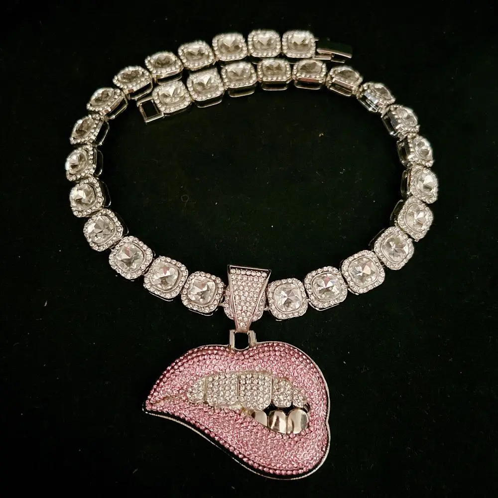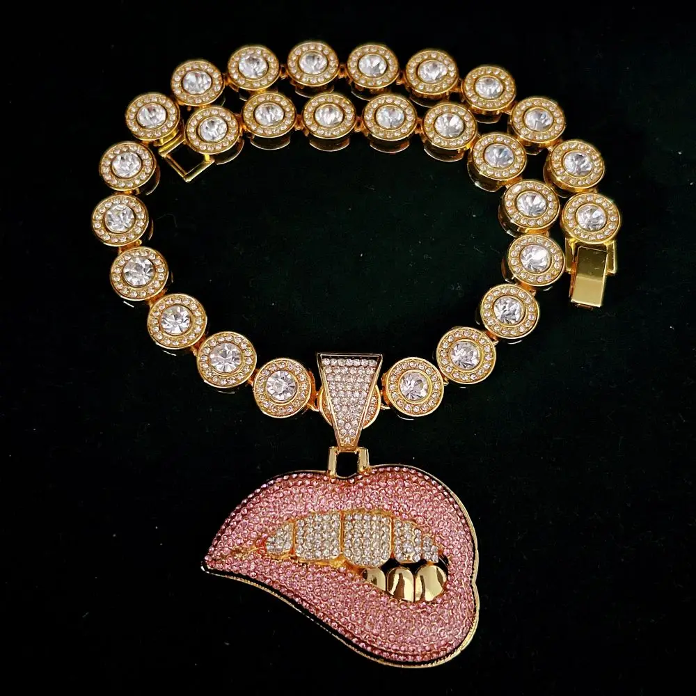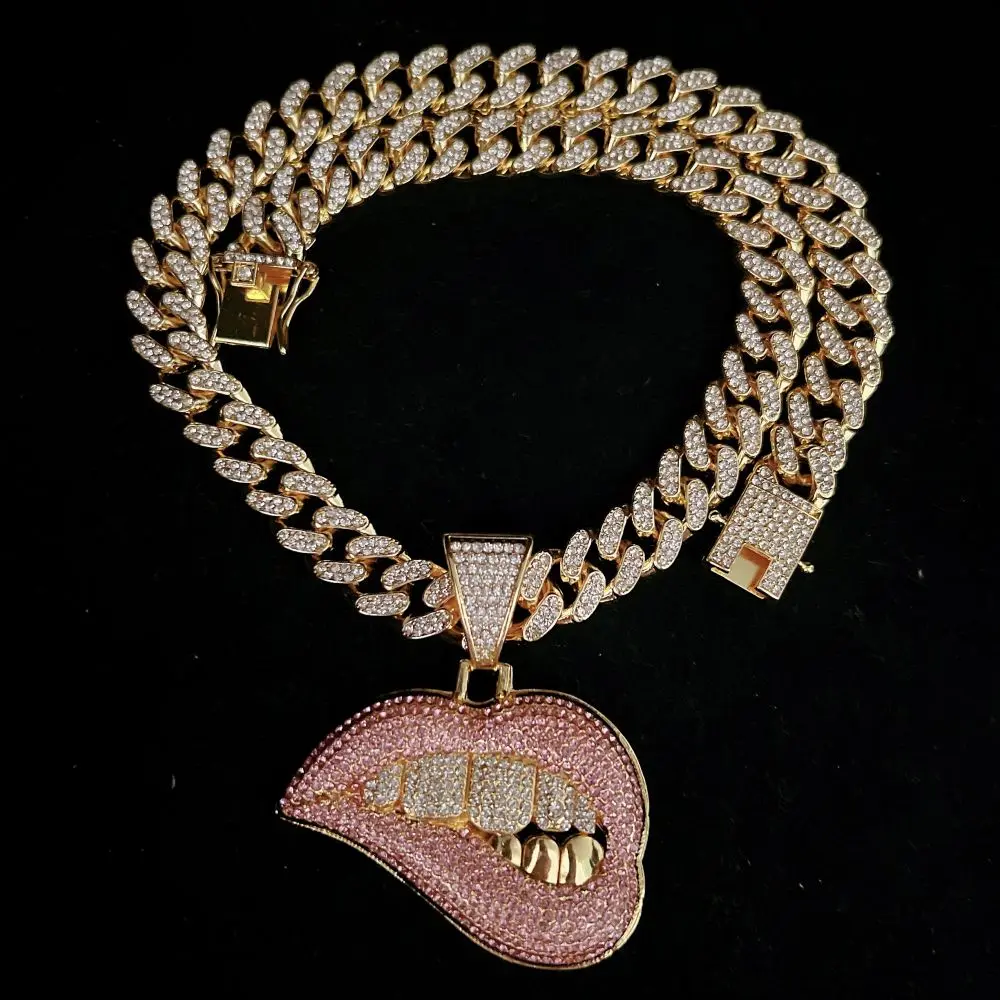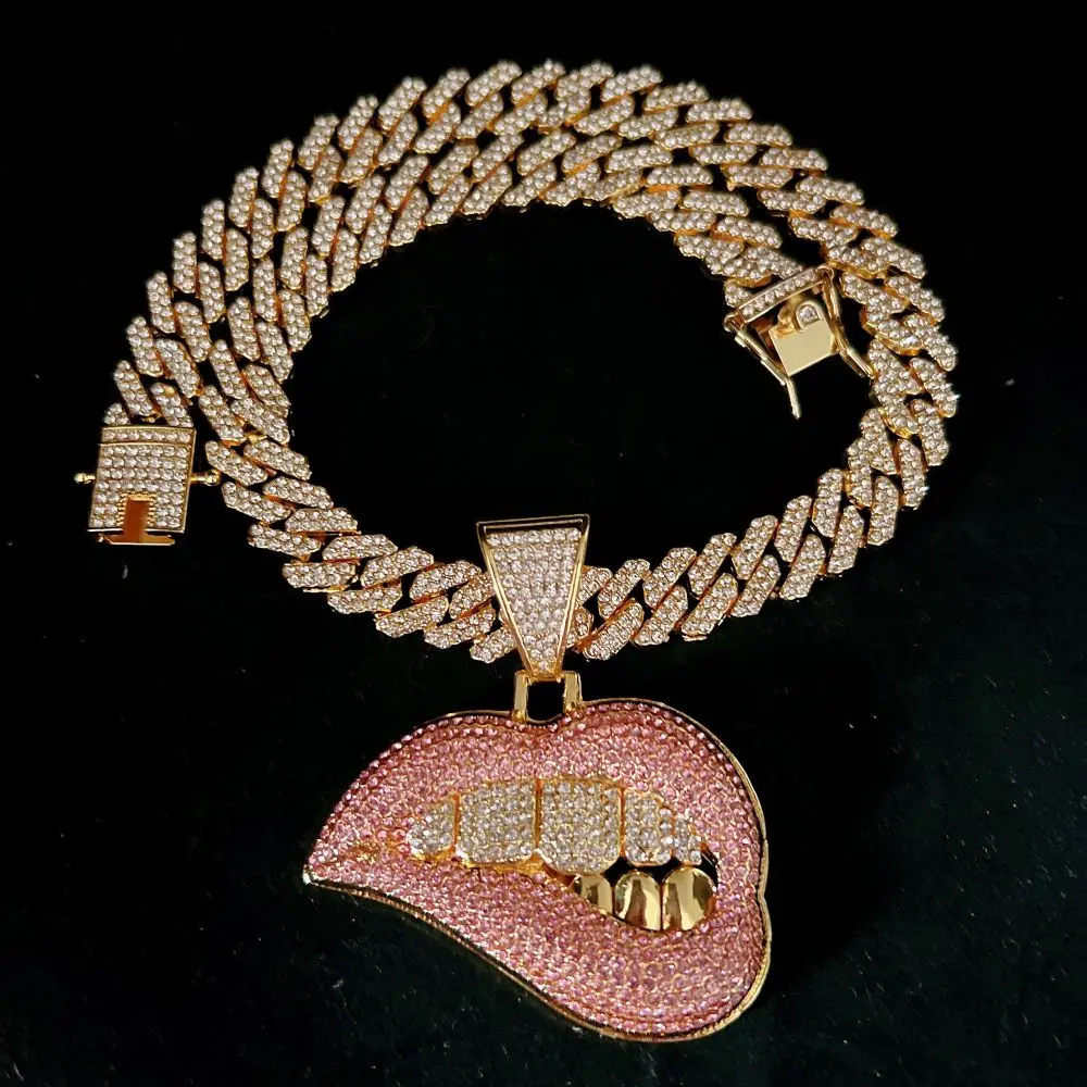 AAA Rhinestone Iced Out Miami Cuban Link Chain Sexy Biting Lips Pendant Necklace For Men's Chains Hip Hop Jewelry On The Neck