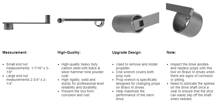 Применение: Prop гаечный ключ специально разработан для изменения реквизитов на приводах Bravo III. Двойной гаечный ключ, который подходит для обоих меркрузер Браво три гайки для удаления и установки пропеллера.