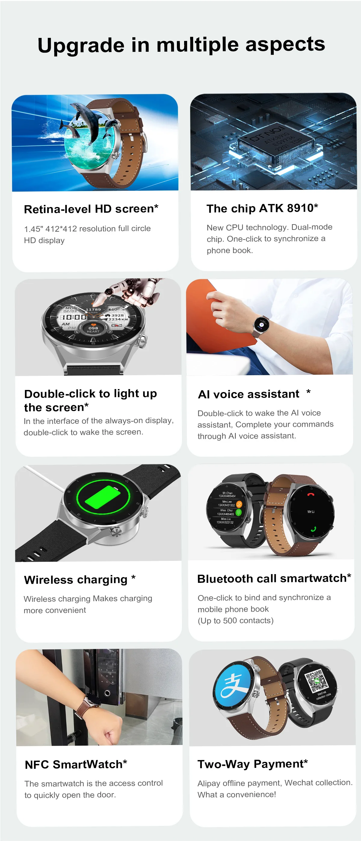 Функции:Тренировка дыхания, нажатие на циферблат, секундомер, регулировка яркости, мультиспортивный режим, сон, частота сердечных сокращений, информация, удаленная музыка, удаленное фото, погода, мобильный телефон (подключен к мобильный телефон), вызов по Bluetooth, воспроизведение музыки по Bluetooth, защита паролем, калькулятор, сплит-экран, быстрый widget, погода, Массажер, Alipay, мой qr-кодСмотрите так же другие товары: