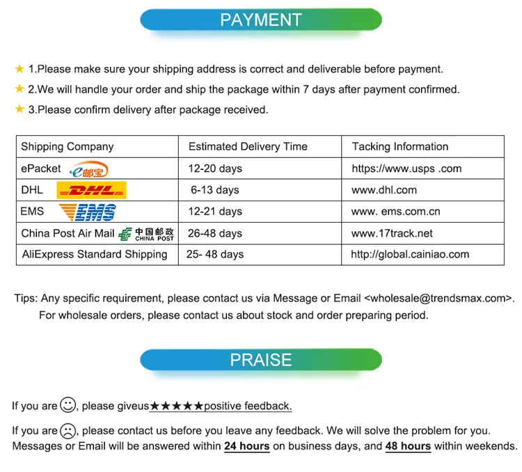3. Когда вы получаете продукт, если вы чувствуете себя удовлетворенным, пожалуйста, дайте нам пять звезд высокой оценки; Если вы не удовлетворены, пожалуйста, свяжитесь с нами в первый раз. Мы постараемся сделать все возможное, чтобы решить эту проблему до достижения удовлетворительного результата.