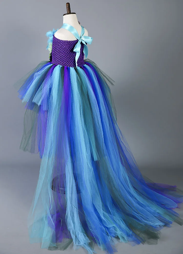 Праздвечерние чное платье принцессы с павлином для девочек, бальное платье ручной работы с павлиньими перьями для маленьких девочек, платья со шлейфом для реквизит для фотографий на день рождения