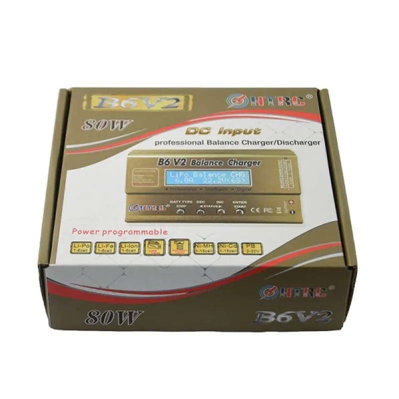 1 * HTRC B6 V2 Зарядное устройство 1 * зарядный кабель с разъемом XT60 и T-plug 1 * Универсальный зажим под крокодила 1 * кабель зарядного устройства PB 1 * Инструкция по эксплуатации