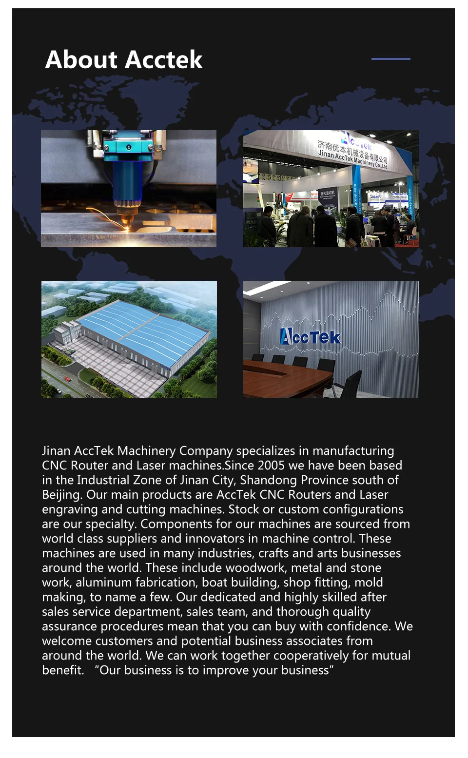 Jinan AccTek Machinery Co., Ltd was located in high technology industry zone of Jinan,which specializes in manufacturing CNC and laser machines since 2005.
