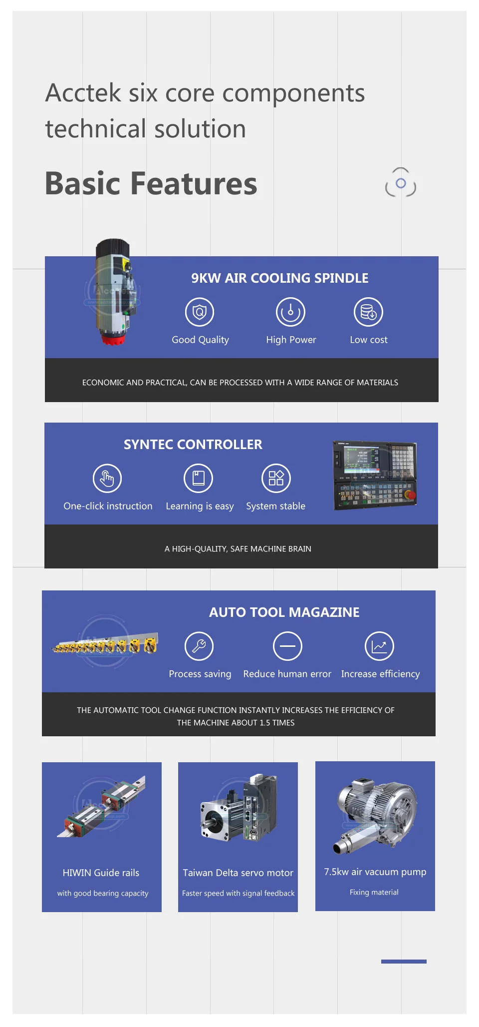 1) Changsheng or HSD Air cooling spindle from Italy, with strong cutting ability, low noise, it can ensure the machine to work