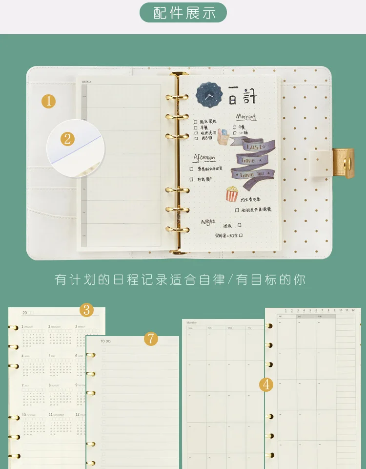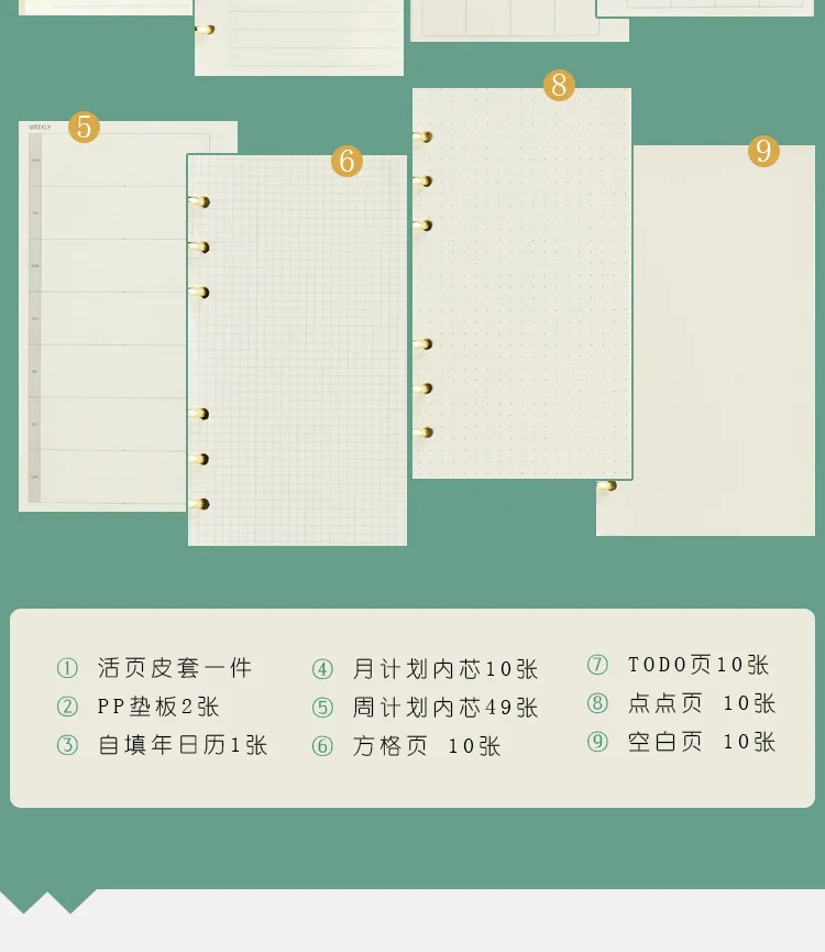 Включает в себя: Binder,1 годовой план, 10 Todo List,10 Ежемесячный план, 49 Еженедельный план, 10 пустых, 10 сеток, 10 точечных