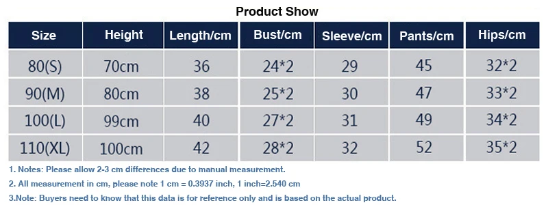 Размеры | Длина/см | Обхват груди/см | Рукав/см | Брюки/см | Предлагаемый возраст |