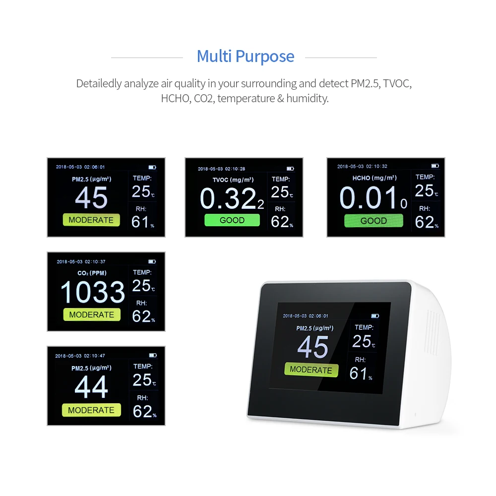 Детально анализируйте качество воздуха в окружающей среде и обнаруживайте PM2.5, TVOC, HCHO, CO2, температуру и влажность.