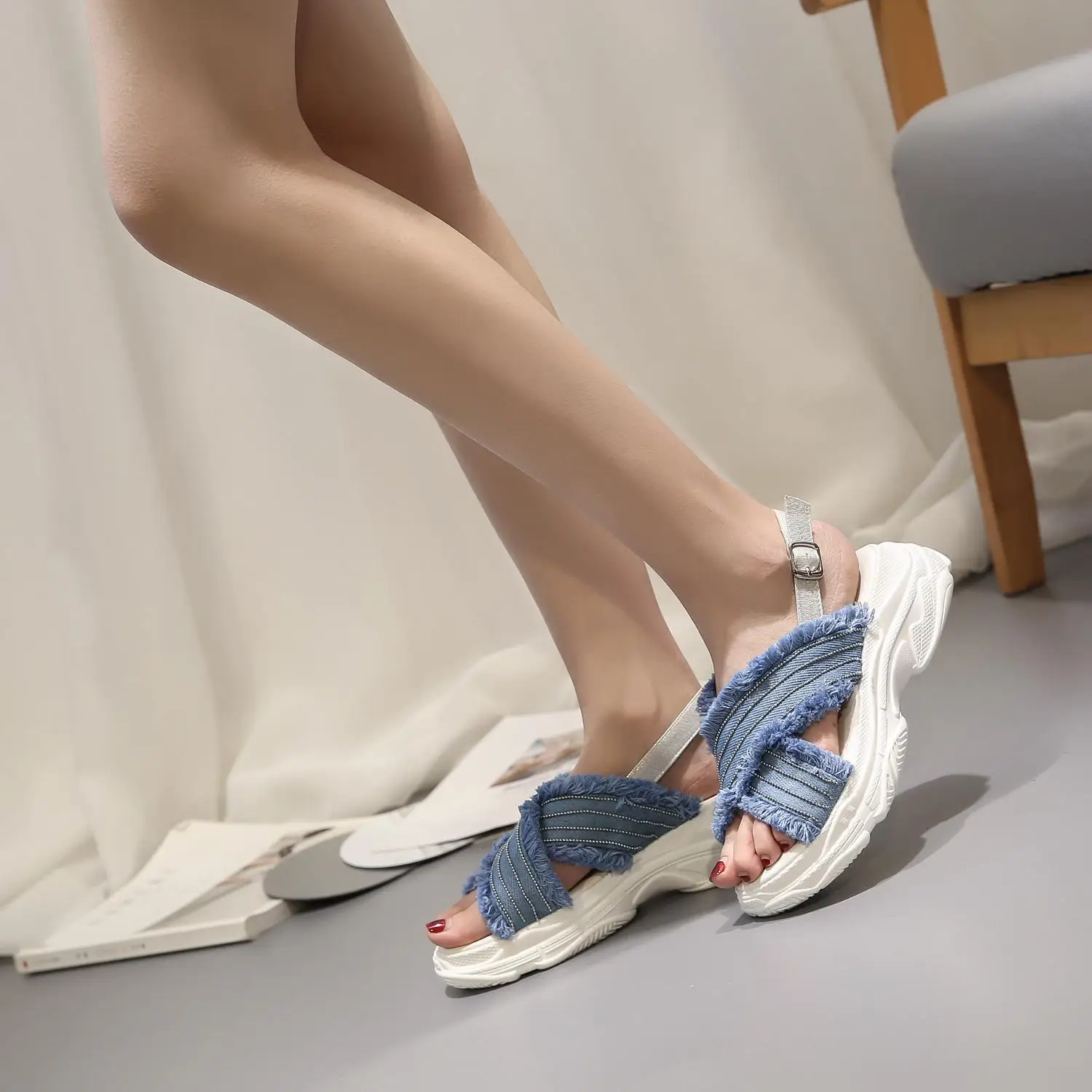 Сандалии женские на танкетке прозрачные шлепанцы в полоску высоком каблуке