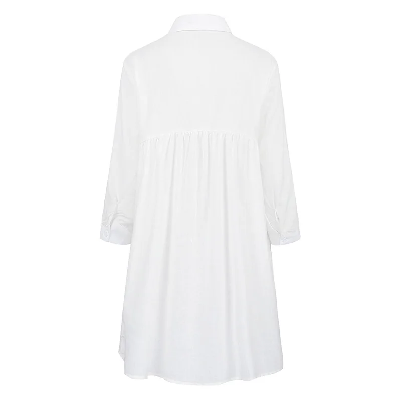 Изготовленная из хлопчатобумажной ткани, эта длинная рубашка мягкая, дышащая и удобная для разных сезонов. Сплошной цвет, отложной воротник, застежка на пуговицах спереди и рукав 3/4. Можно носить как повседневную рубашку или накидку на лето.