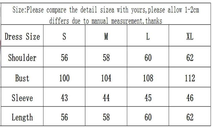 There is 2-3% difference according to manual measurement. please check the measurement chart carefully before you buy the item. 1 inch = 2.54 cm Please note that slight color difference should be acceptable due to the light and screen. 1 x Women's Tops |
