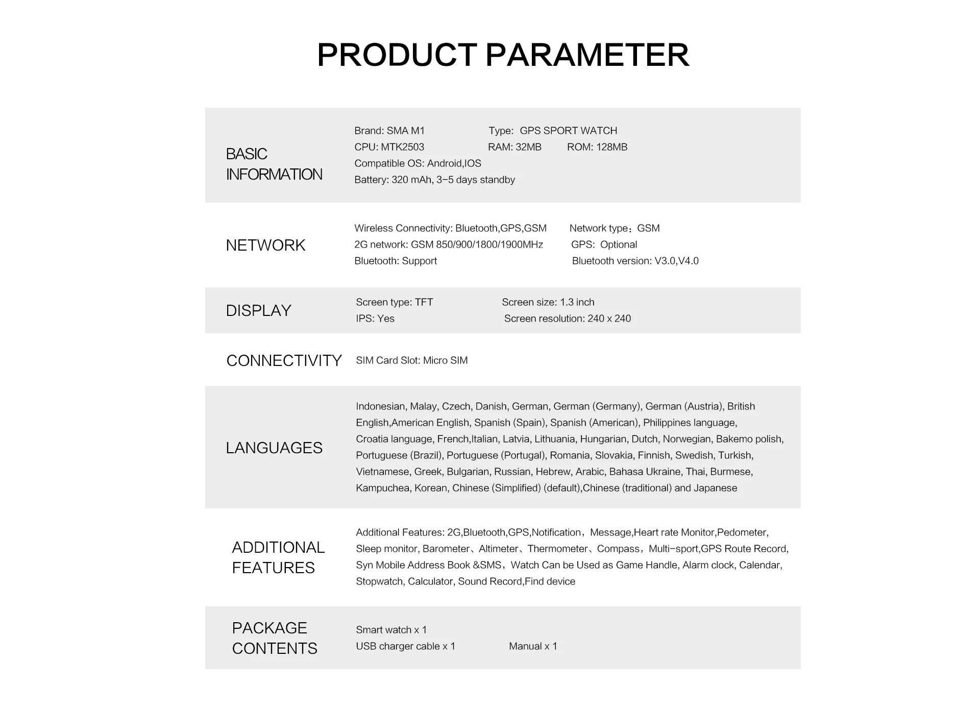 * Дополнительные функции: барометр, датчик давления, геомагнитный, гироскоп, сожженные калории, автоматические записи активности (шаги, расстояние, бег), дистанционное управление камерой, отклонение звонящего, управление музыкой/микрофон/динамик, Bluetooth музыка, анти-потеря, погода в режиме реального времени, Вибрационный сигнал, датчик на запястье, найти телефон, напоминание о сидении