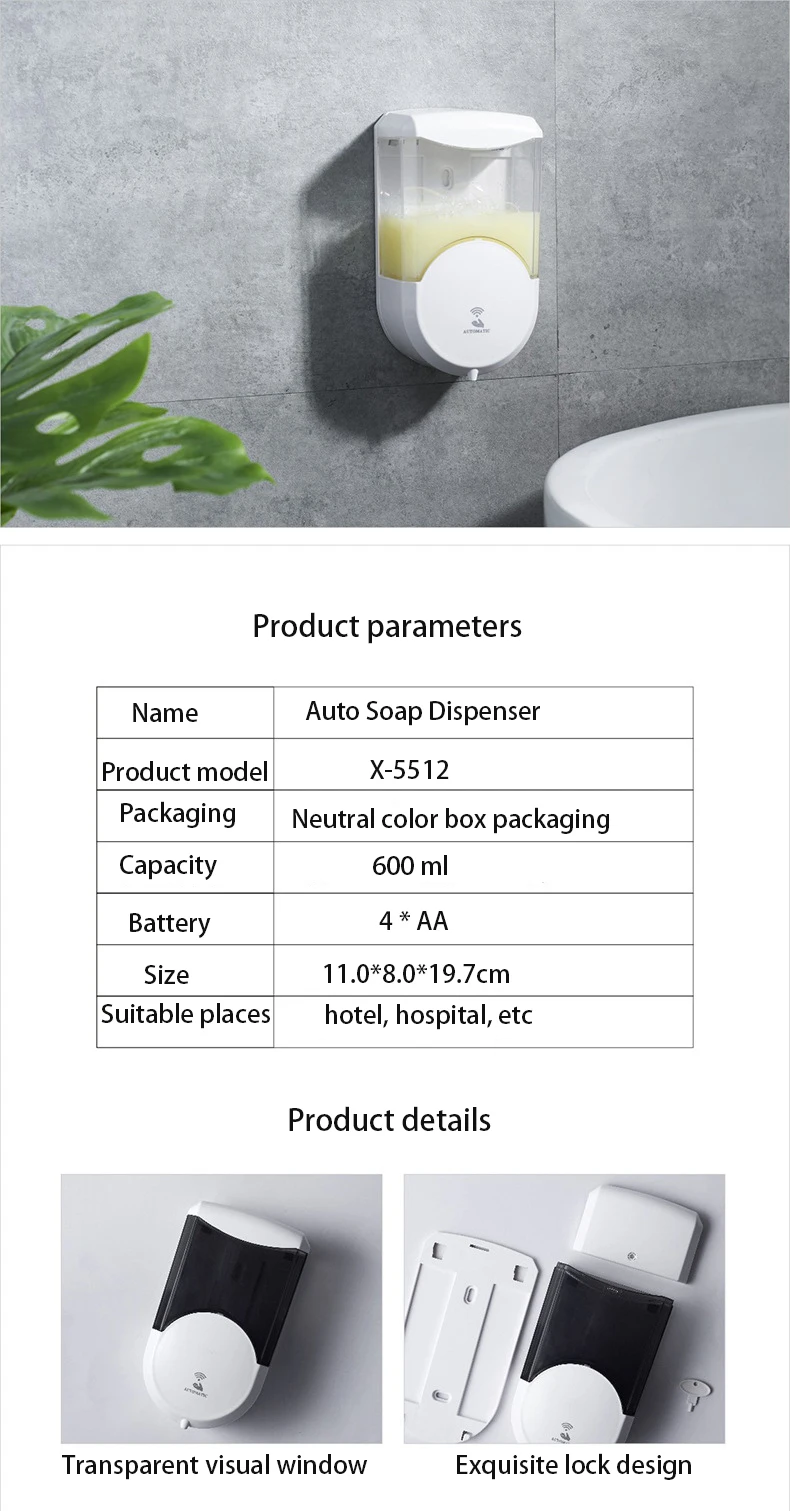 Наименование: автоматический дозатор мыла Ёмкость: 600 Размеры: 11,0*8,0*19,7 см Аккумулятор: 4 * AA Материал: АБС-пластик