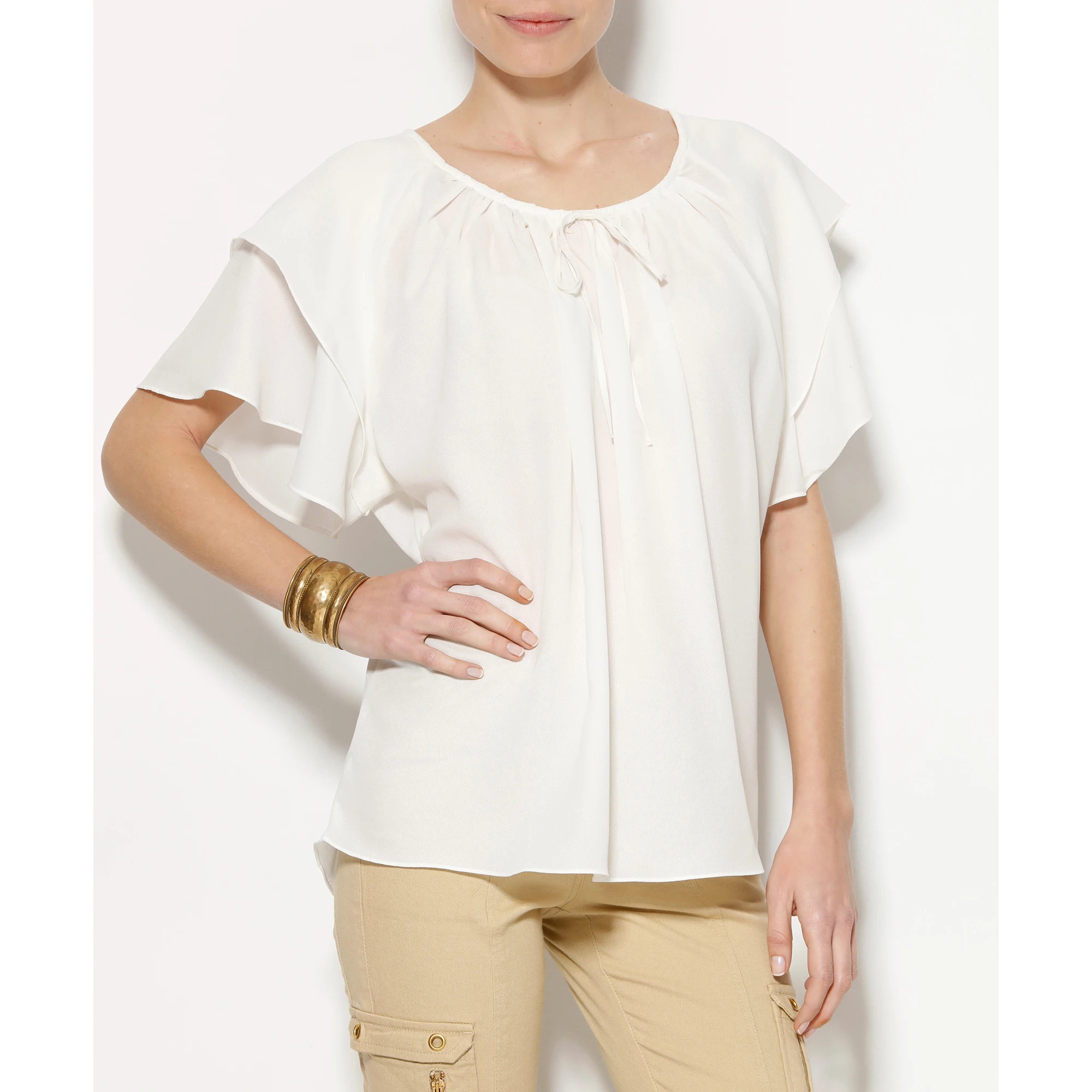 Безупречный blusa de coqueta manga corta que realza tu feminidad y te ayudara a estar perfecta en cualquier situacion. Viste todos tus momentos con esta blusa de favorecedor escote fruncido en el delantero y la espalda, con Романтика манга corta de doble capa. Una blusa que dara muesras de tu estilo elegante y sofisticado, confeccionada en suave crepe 100% полиэстер. Largo aprox 65 см.