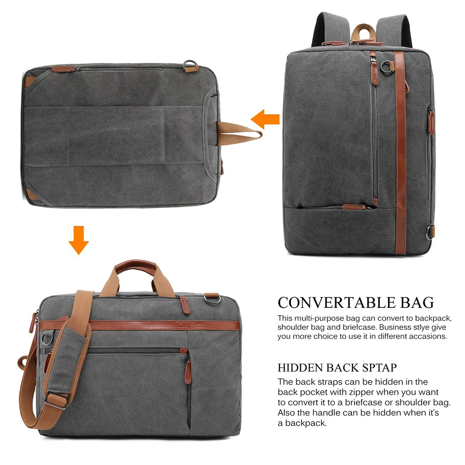 Бренд: CoolBELL Описание: мульти-функциональная сумка Размер: 18,8x5,1x13,7 дюймов; подходит для ноутбука размером до 17,3 дюймов. Вес: 1,5 кг Цвет для заказа цвета: черный, серый Материал: холщовая нейлоновая ткань Оксфорд; 210D Водонепроницаемая подкладка из полиэстера; натуральная кожа Три модели для переноски: Стиль рюкзака : Удобное заднее ременное крепление, легкое и удобное для загрузки на спине. Сумка на плечо, стильная, : Один задний карман для скрытия задних ремней, Сумка Стиль : Один задний карман для скрывания задних ремней, когда вы используете его в качестве сумки-мессенджер.