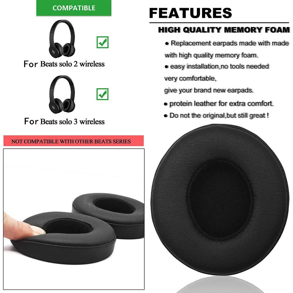 Цвет: черный 100% новые и высококачественные. Совместимость: Эти Сменные амбушюры для Beats Solo 2,0/Solo 3,0 wireless Простота установки: Простота установки и использования, одна из амбушюров имеет зазубрину для беспроводного зарядного устройства для наушников Beat Solo. Прочный клей: стикером на клейкой основе 3M VHB на задней части Бериши серьезно повышает шансы на то, что эти амбушюры никогда не отваливаются. Удобные и прочные: изготовлены из прочной кожи и пены с эффектом памяти, Амбушюры имеют гладкую поверхность и комфортное прикосновение. Улучшенный звук: пена памяти усиливает засорение шума.