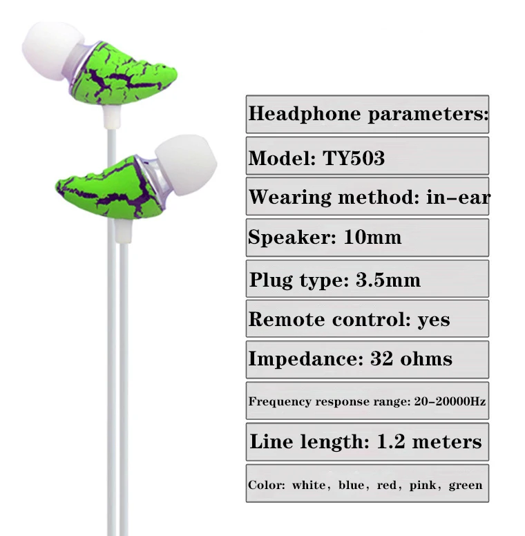 Headphone parameters: Model: TY503 Wearing method: in-ear Speaker: 10mm Plug type: 3.5mm Remote control: yes Impedance: 32 ohms Frequency response range: 20-20000Hz Line length: 1.2 meters Color: white,blue,red,pink,green