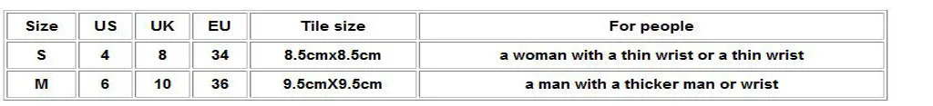| S | 4 | 8 | 34 | 8,5 см x 8,5 см | Женщина с тонким запястьем или тонким запястьем |