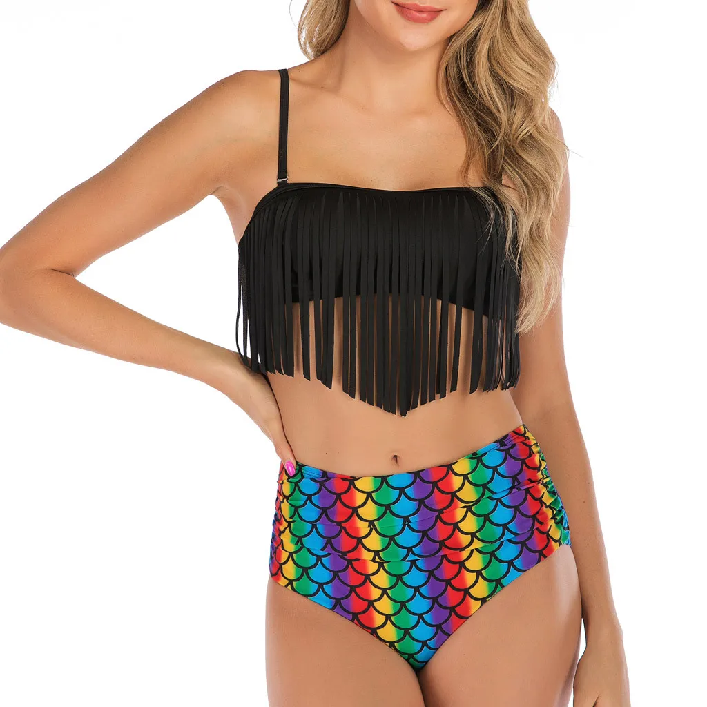 Летний сексуальный купальник с кисточками и принтом рыбьей чешуи, женский купальный жилет из двух частей, гофрированный купальник бикини с высокой талией 40 *