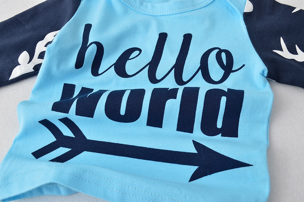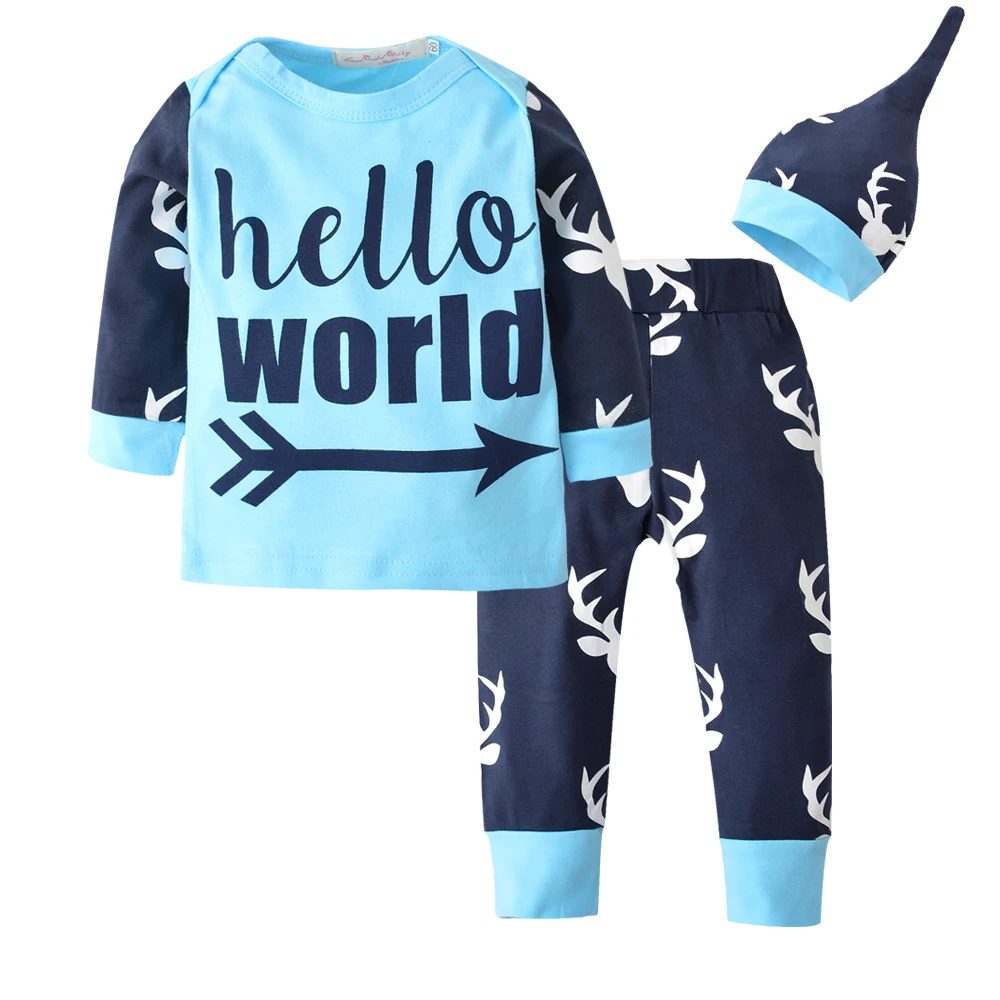 Модный дизайн, 100% новый, высокое качество! Материал: хлопок Тип узора: мультяшная буква Длина рукава: длинный рукав Основные Цвет: как показано на рисунке Подходит для: маленького мальчика В комплект входят: Топы + штаны + шапка Стиль: Мода