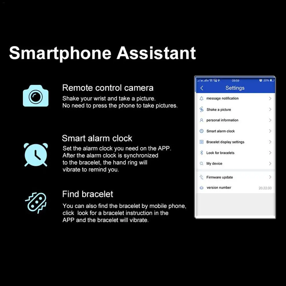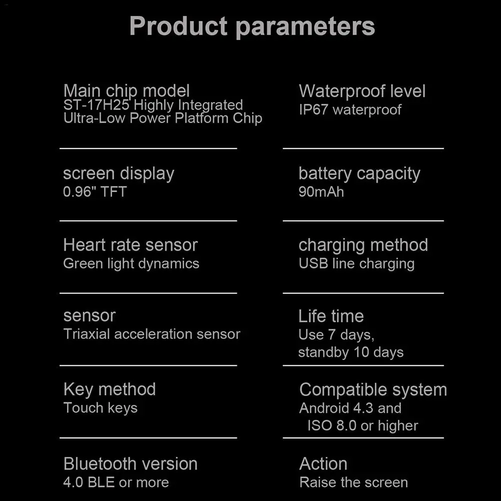 Динамический мониторинг сердечного ритма и артериального давления, спортивный шагомер (3D датчик), потребление калорий, расстояние, связь Bluetooth, напоминание о звонках, информационное напоминание, активация экрана, поднятие руки, умный будильник, поиск браслета, удаленная съемка фотографий, напоминание о малоподвижности, мониторинг сна, push-уведомления (SMS, Wechat, QQ, Facebook, Twitter, WhatsAPP и т. д.), чтение информации и т. д.