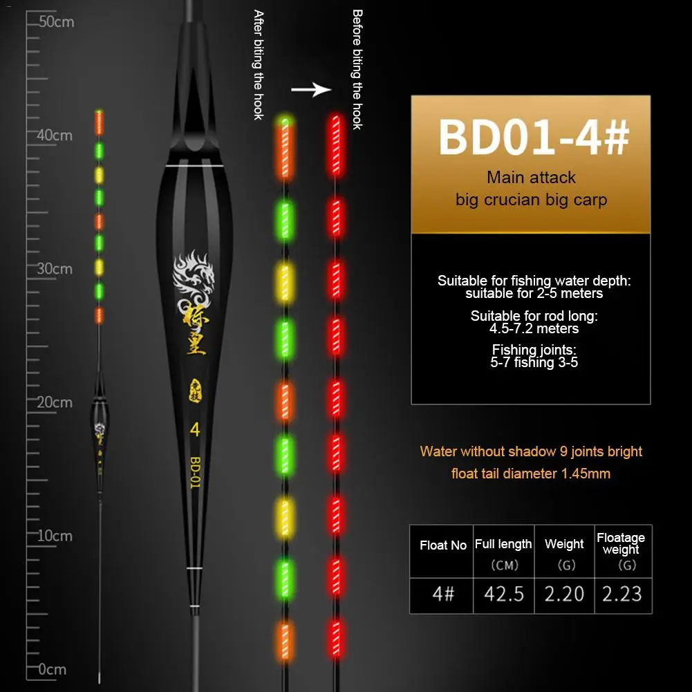 Светодиодный индукционный светящийся поплавок для дня и ночи; Инновационный поплавок, шар с 11 сетчатыми плавающими концами, чистый день, ночная ловля, видимость в пределах 8 метров в течение дня, видимость на 8 метров в ночи;Улучшенная версия 5,0 smart chip, низкое энергорасход, повышенная яркость, точный сигнал;Долговечность жар-термоусадочная трубка, три-слой армирования, высокая прочность, сильный несущей, усиленные крепления;Нет изменения цвета при качающемся положении, изменение цвета вверх и вниз;Улучшенный поплавок, подводный, без светильник, не беспокоит рыбу.1 * светящийся поплавок для рыбалки + 1*425 кнопочный аккумулятор (сменный)